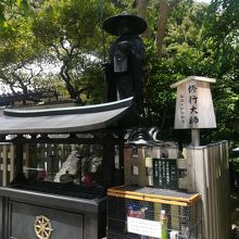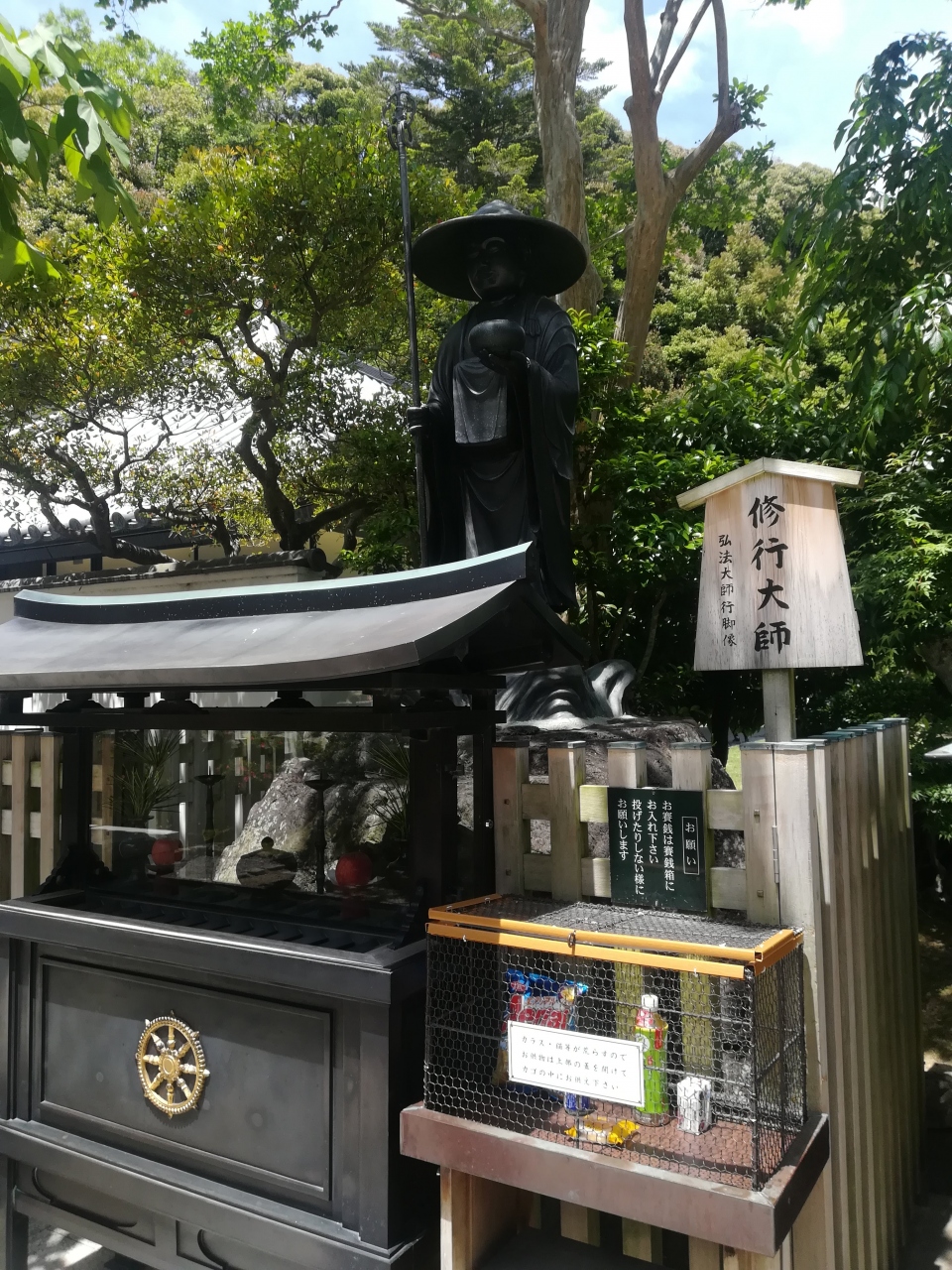 拝殿への階段に向かう道と史料館との間の左側に立っておられました。弘法大師様が全国を行脚されたお姿をあらわした立像とのことで大きなものでした。お賽銭箱とともにお供え物を入れる箱もあり信仰を集めていることがよくわかります。
