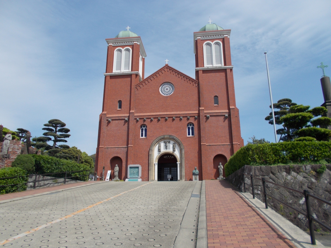 この浦上天主堂は明治の時代に建てられました。1879年に小聖堂を建てて翌年に今の場所に天主堂をつくり1914年に完成しました。当時は東洋一のロマネスク様式の教会です。原爆で崩壊しました。その一部は平和公園に移築しています。また前庭には被爆した石像などが展示されています。1980年に今の教会が再建されました。レンガ色の美しい姿です。