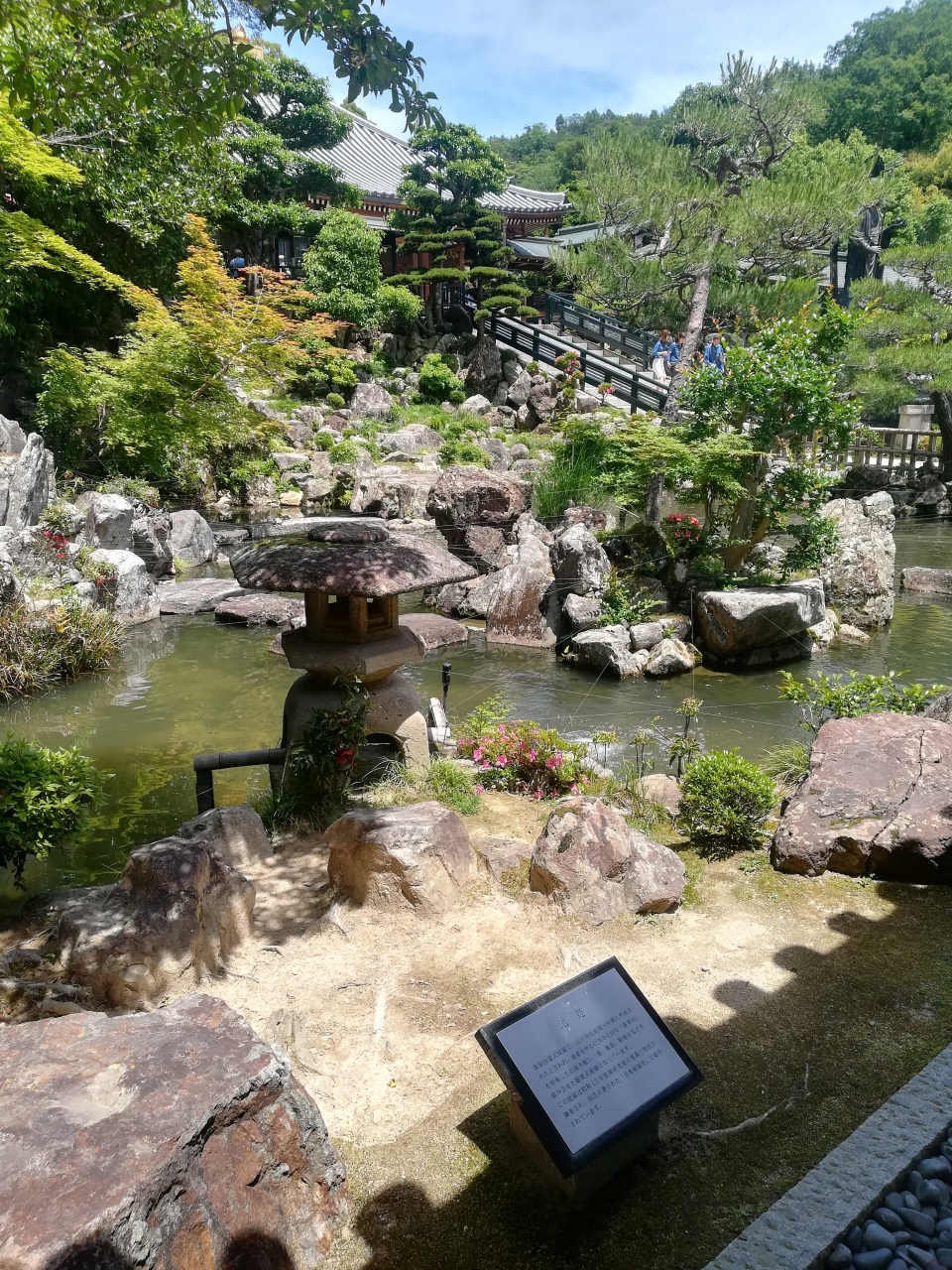 本堂にあがる階段の左側に広がっている回遊式庭園で、江戸時代に造られたそうです。石灯籠に加えて、大きな自然石と思われるものが豪快に配置されていました。鯉や亀などもいてちょっと一休みしたくなる雰囲気でした。
