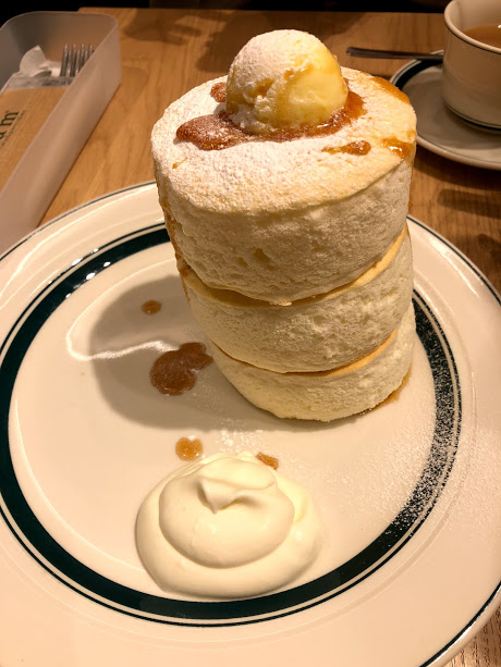 ふわっふわのパンケーキを探していた時にこのお店を知り、いつか来てみたいと思っていたところ、ついに機会に恵まれました。土曜日に友達とランチをするところを探して歩いていたところ、「4時からの焼き上がりの回に空きがあります」と店頭で声をかけていただき、その場で予約を入れました。2時過ぎだったかと思います。時間まで、同じ建物の並びにあるイタリアントマトで軽くランチをしながら時間をつぶし、10分前に来てくださいとのことだったので伺いました。遅めのランチ直後だったこともあり、二人で一つのプレミアムパンケーキとそれぞれの飲み物を注文しましたが、ランチ後のデザートとしてはそれで充分でした。ぷるっぷるのパンケーキ、中はふわっふわで、とても口触り良く美味しかったです!店員さんもとても良く、特に店頭で予約に対応してくれた方の対応は良かったです。また時間があるときに予約が取れるようであれば行きたいと思っています。