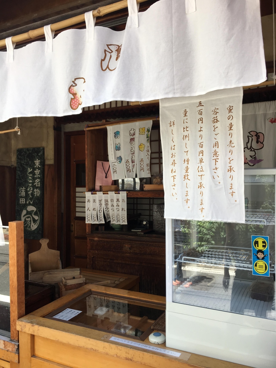 お勧めはところてんを蜜のみで食べることです。蜜は、白蜜、黒蜜、抹茶蜜と3種類あり、食べ比べが出来ます。ところてんも切り方を選べます。蜜の絡み方が変わるのでいろいろと試したくなります。