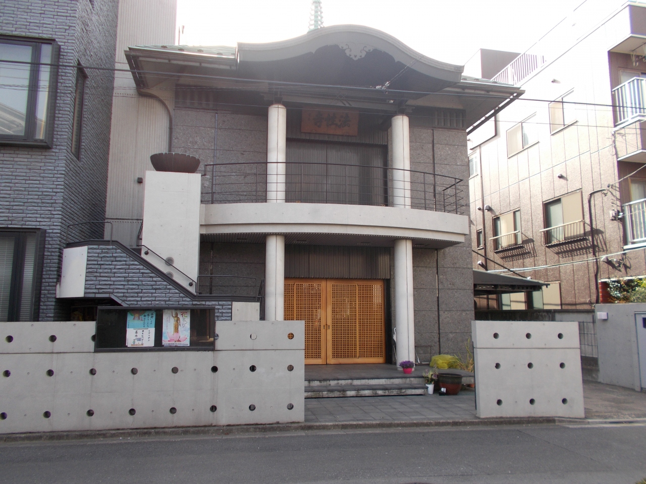 法性寺は17世紀前半に霊厳寺の塔頭として創建されました。霊厳寺とともに17世紀後半に今の三好に移築しています。場所はかつては霊厳寺の参道にあたる場所にあります。この寺は関東大震災後に安禅寺を併合しています。今はコンクリート造りですが円柱などをとりいれたモダンな作りです。新しいの寺の景観を感じます。