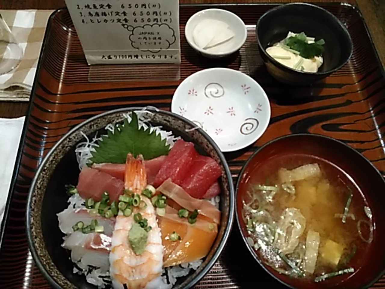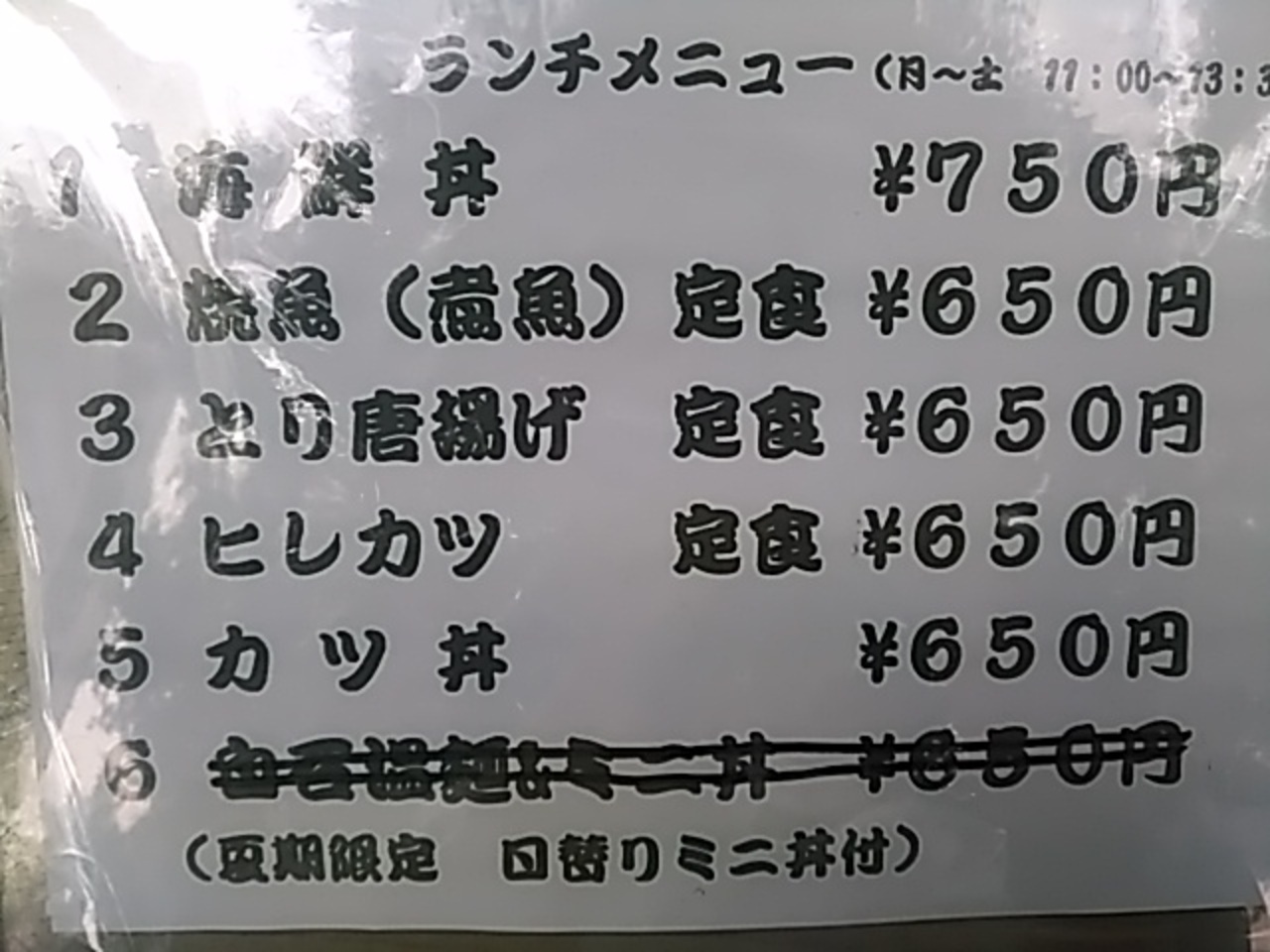 ランチは4種類。海鮮丼750円の他は定食類は650円です。大盛りは100円増しです。
