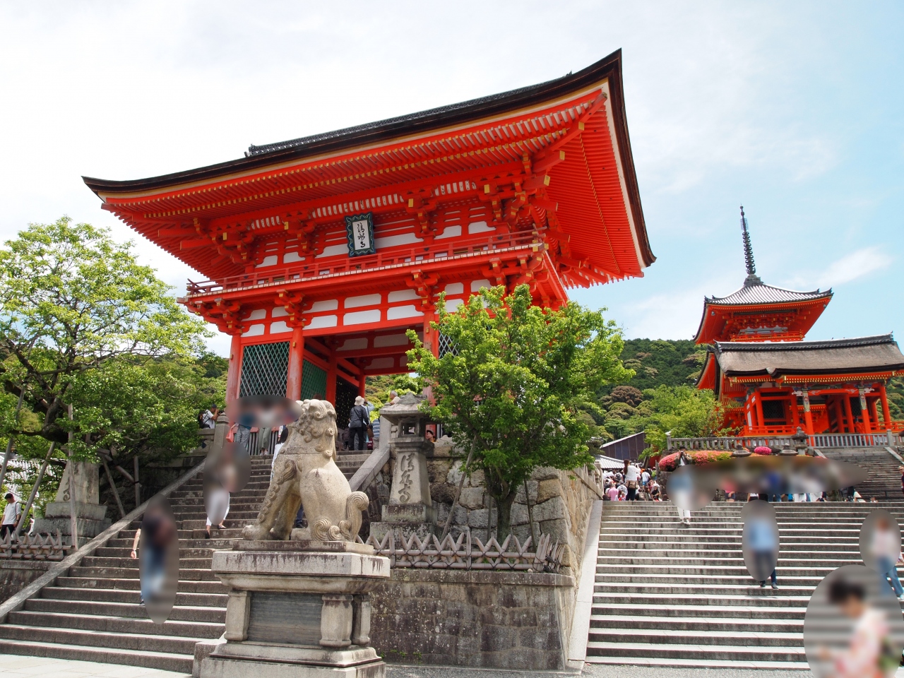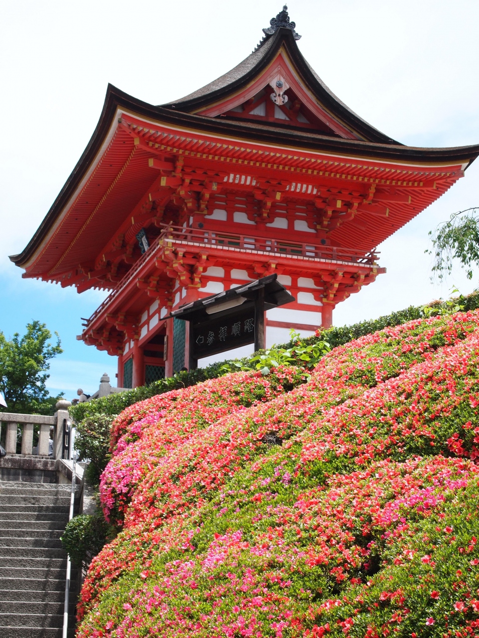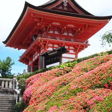 清水寺を代表する景観の一つの正門の仁王門です。重要文化財に指定されています。清水坂からのぼってくると、先ずここに到着しますので、門前は写真を撮影する観光客で溢れています。少し右側に下ったところの斜面につつじが植えられていて大変綺麗に咲いていました。
