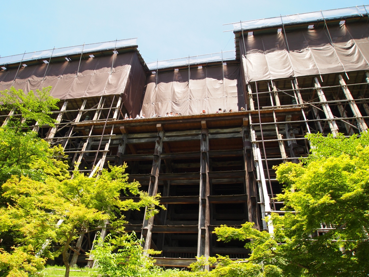 京都を代表する観光スポットの清水寺です。国宝の本堂は2018年5月現在、平成の大修理として屋根の葺き替え工事を実施中の為、外観から見ることができません。御本堂を参拝することは可能です。修学旅行と海外からの観光客で、本堂前は通勤ラッシュなみの混雑です。殆ど心落ち着けて参拝する事はできません。