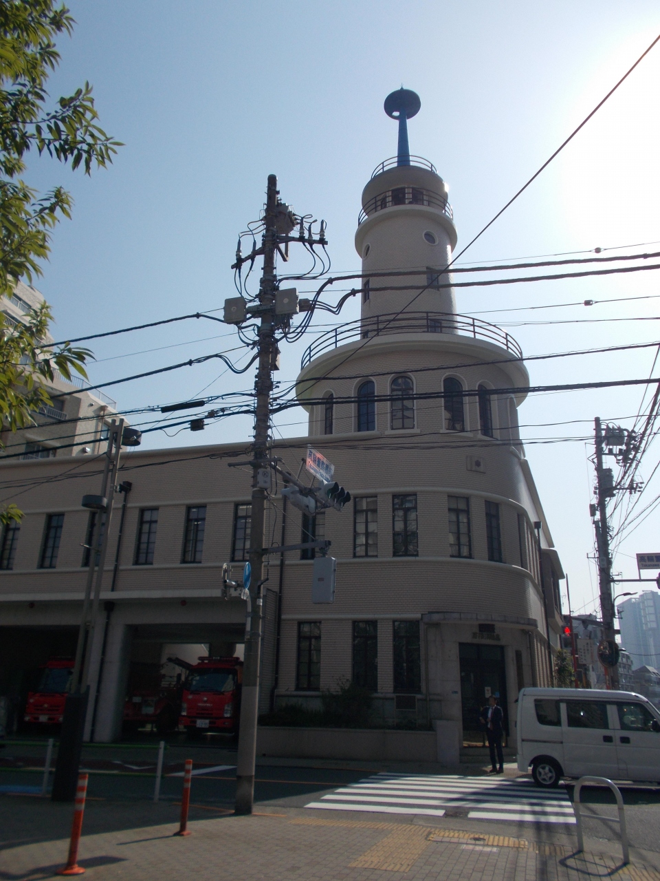 この高輪消防署二本榎出張所は高輪警察署と道を挟んであります。この建物は今もスマートな塔があります。今は周りは高い建物が多いのですがかつては東側のエリアは坂下になっているので遠くまで見れると思います。塔は火の見櫓です。