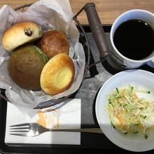 コーヒー、ミニサラダ、5、6種類のパンが食べ放題で、500円。