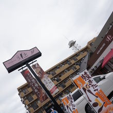 ピンクの看板が周囲の建物より高く立っているので分かりやすいと思います。