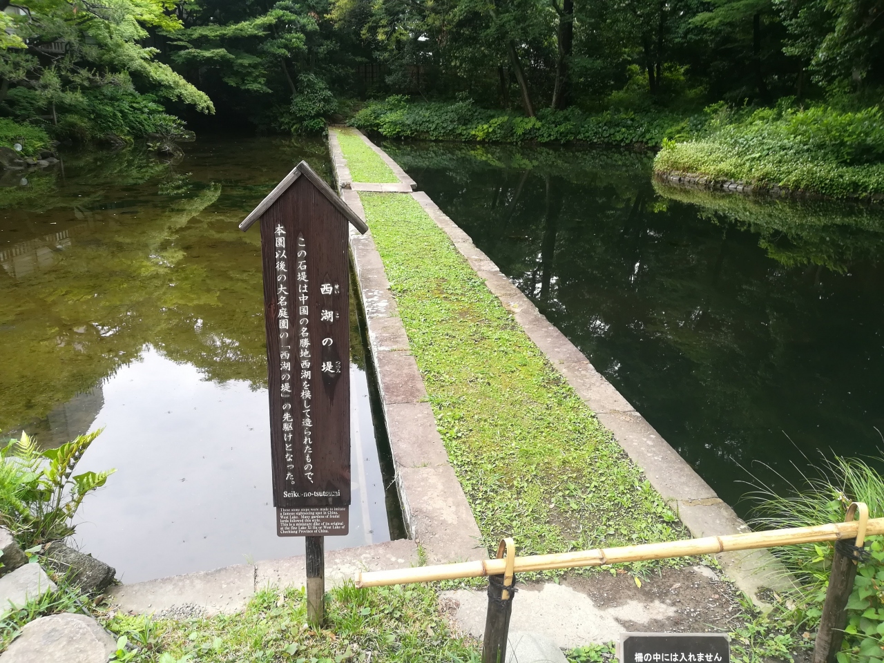 中国の杭州にある西湖にかかる堤を模しているそうです。西湖の堤は江戸時代の庭園には多いようで、浜松町近くの旧芝離宮恩賜庭園にもあったと記憶しています。湖水を2分するようにまっすぐに伸びた姿が印象的でした。