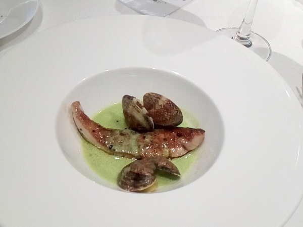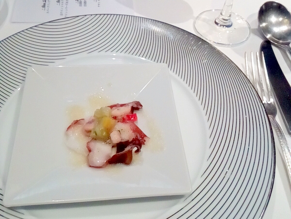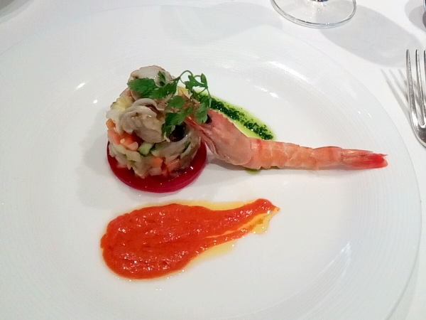 アミューズはタコとイカのカルパッチョ、前菜は野菜レギュームタルタル仕立て、ホタテ貝のマリネと有頭エビ添え、魚料理はイナダのポワレ、あさりソース、肉料理は牛ロースのグリエでした。