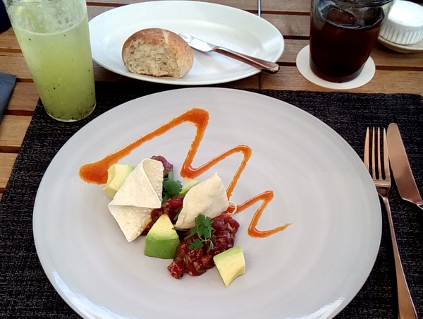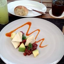 前菜はマグロとアボカドのタルタル パパダムコチジャンドレッシング