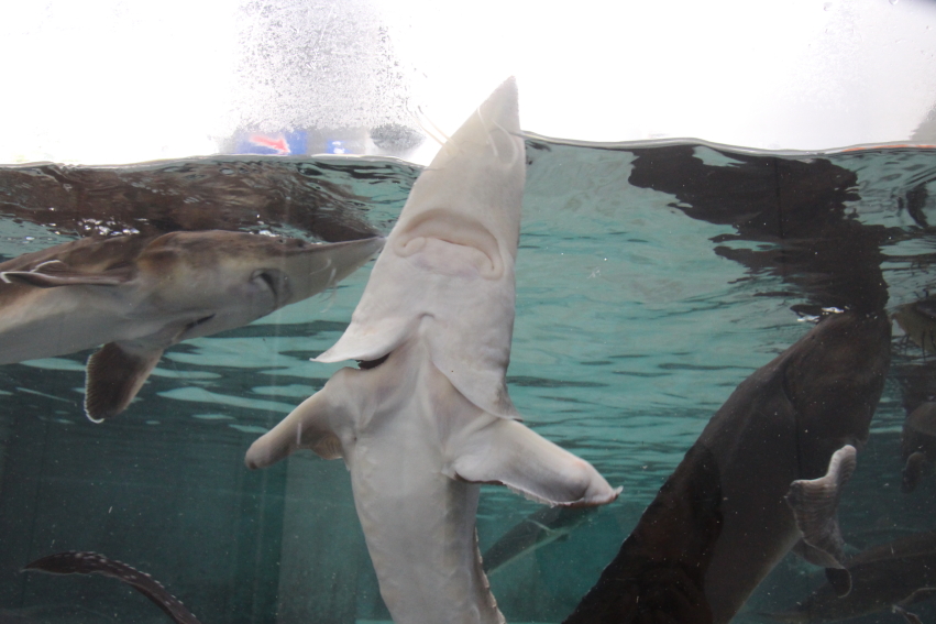 館内の一画にはチョウザメが飼育されています。餌が貰えると思っているそうで、縦になって顔を出して泳いでいますが、そこに手を差し入れると餌と間違えてぱくりと咥えてきます。歯がないので危ないとことはありません。咬まれる(=咥えられる)と、係員の人が待ってましたと、その証明書をくれます。また、ドクターフィッシュの体験コーナーもありました。