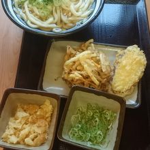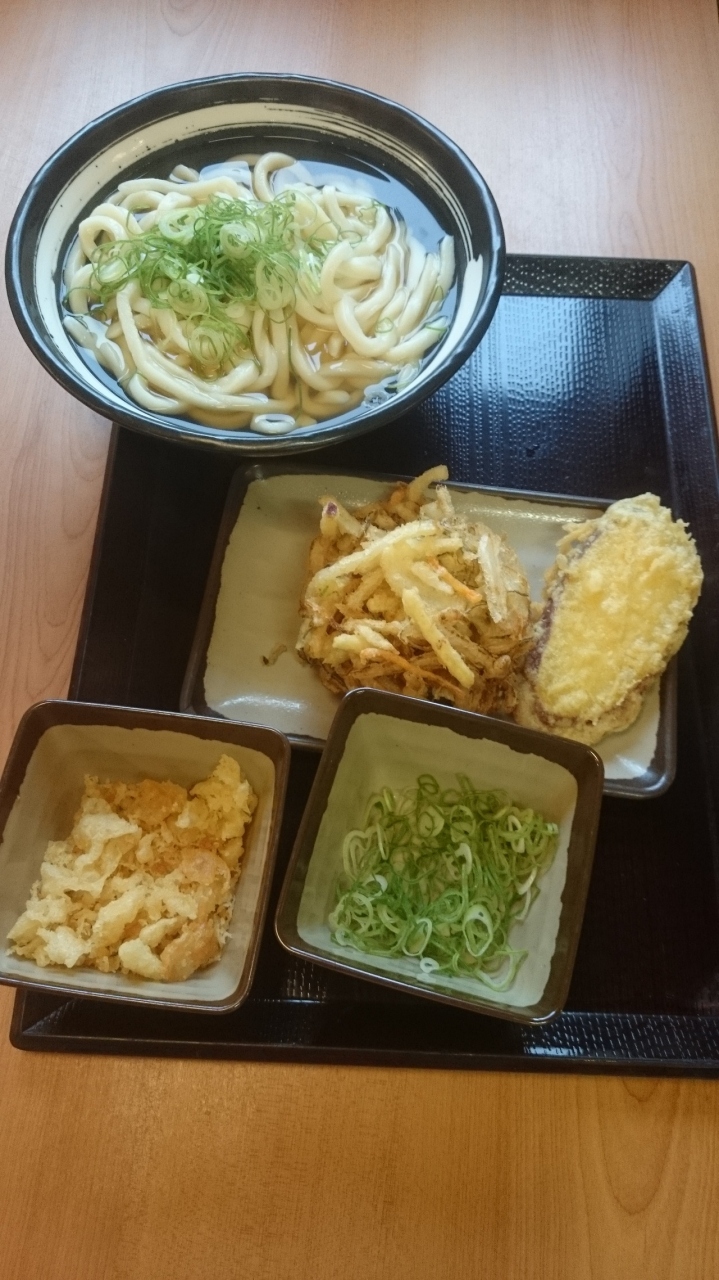 日曜日の晩ごはんで嫁ちゃんと子ども二人とお邪魔しました。かけうどんの特大とざるうどんの特大、ふりかけおにぎり、さつまいも天ぷら、かき揚げ天ぷらをシェアして食べました。天ぷらがさくさくしててなかなかおいしかったです。また機会があったら利用したいと思います。