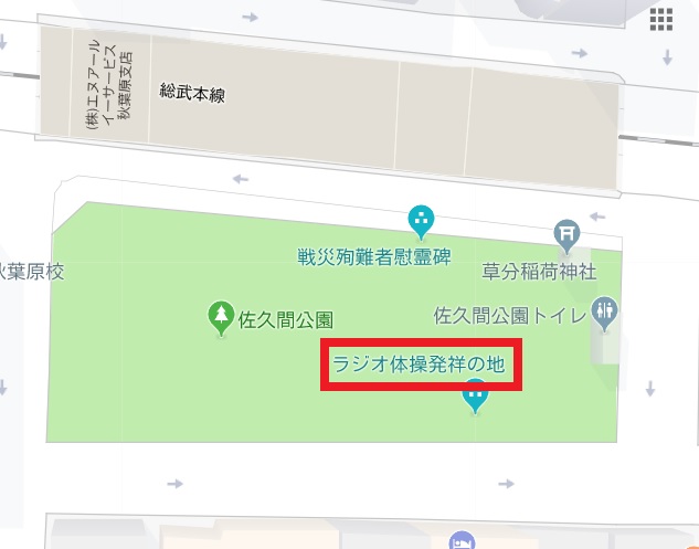 ラジオ体操会発祥の地の記念碑が、秋葉原の佐久間町公園の南側にあります。