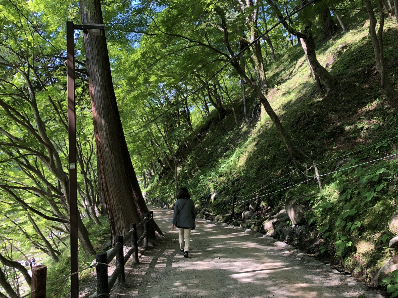 香嵐渓の巴川の遊歩道は、川側と山側にモミジが植樹されており、上空を遮るように生い茂っています。それはまるでモミジのトンネルを歩いているようでした。私が行った5月GWの頃は、新緑の青モミジがいっぱいでしたが、秋はどんな凄いトンネルになっていることでしょう。次回は絶対の秋のトンネルに来るぞと決意したところです。