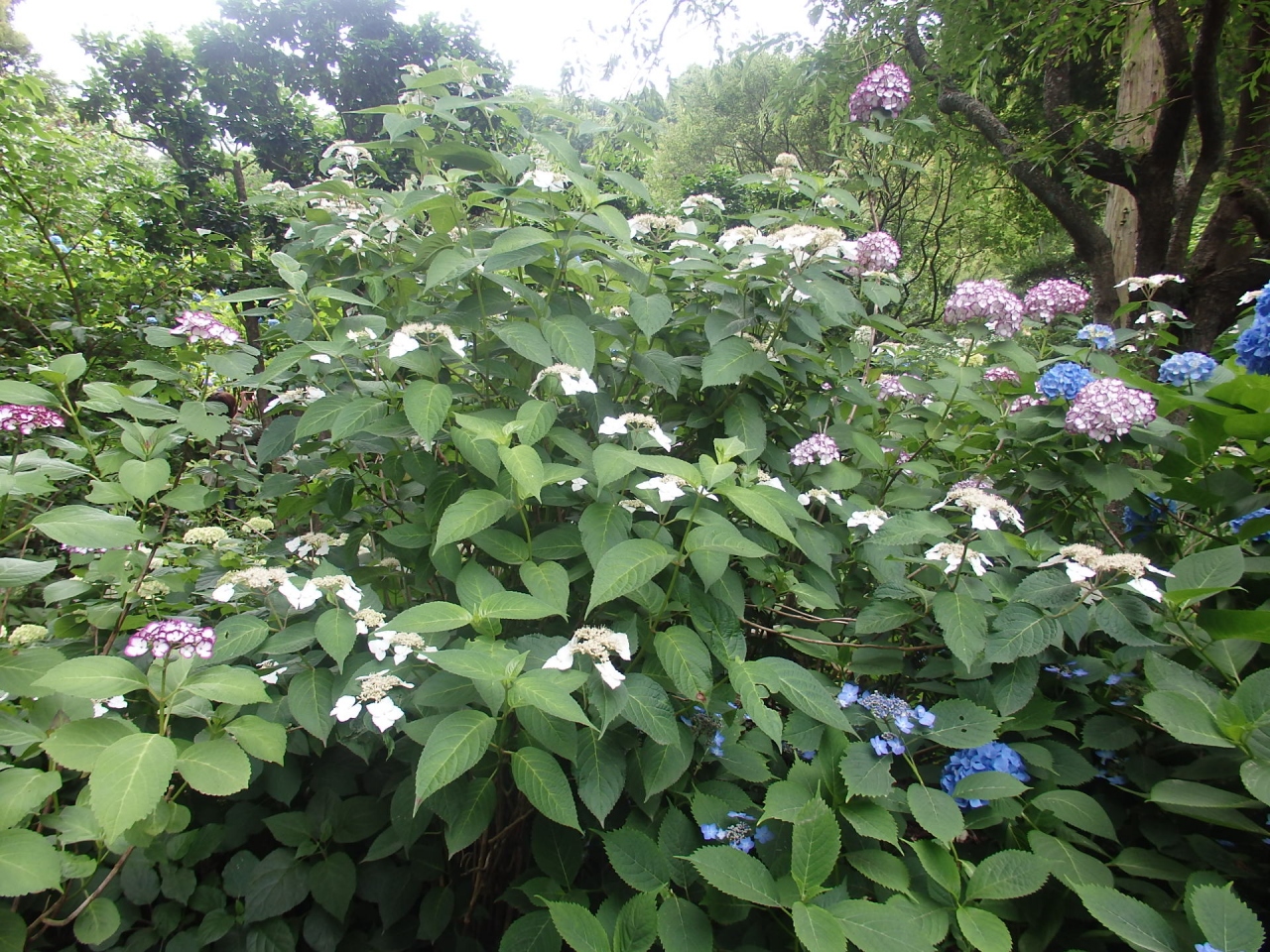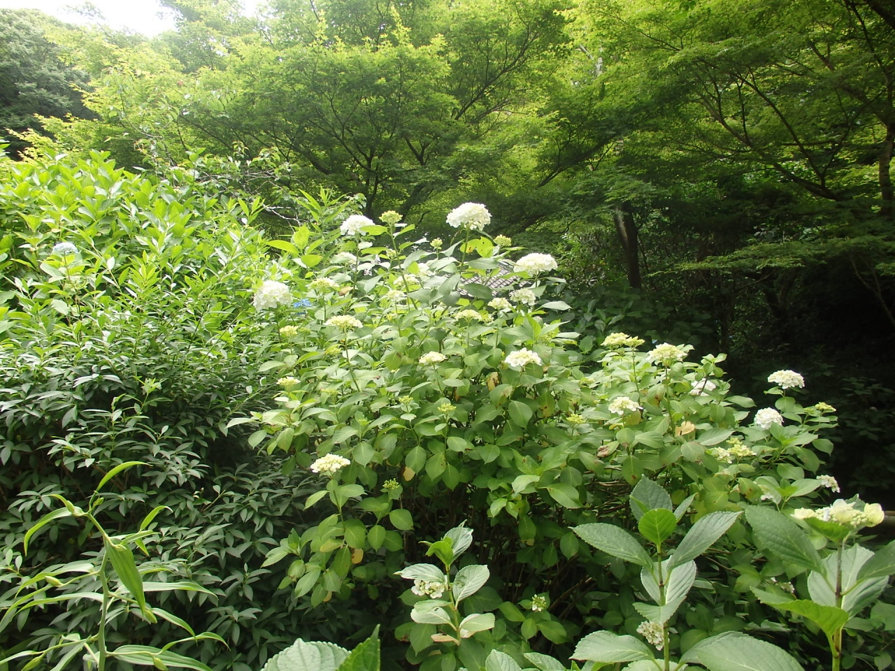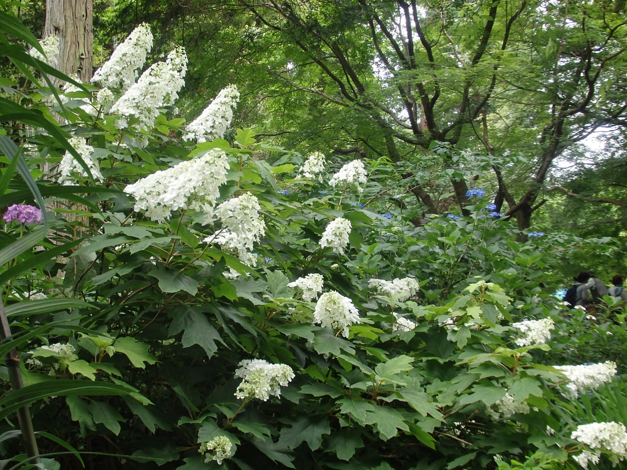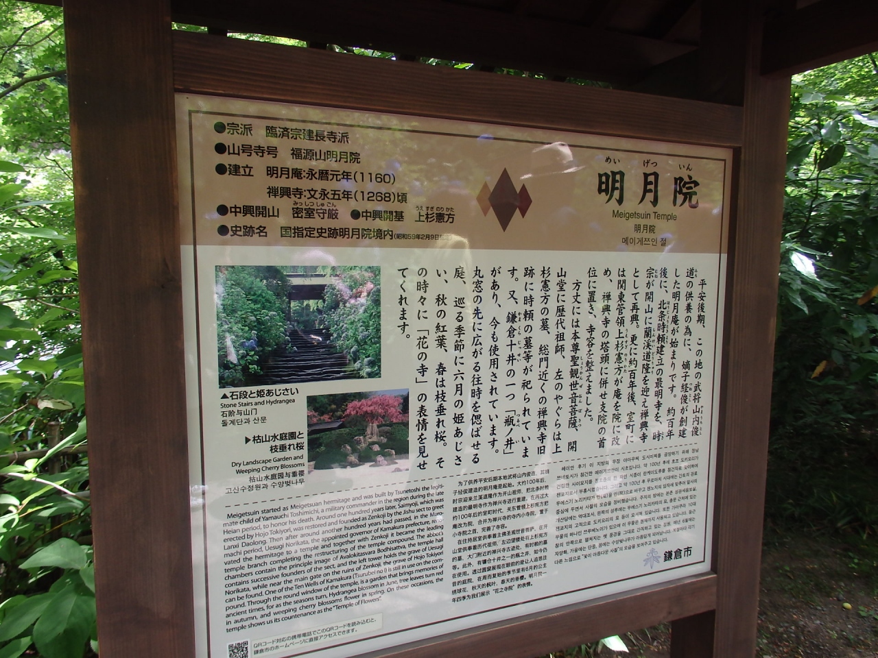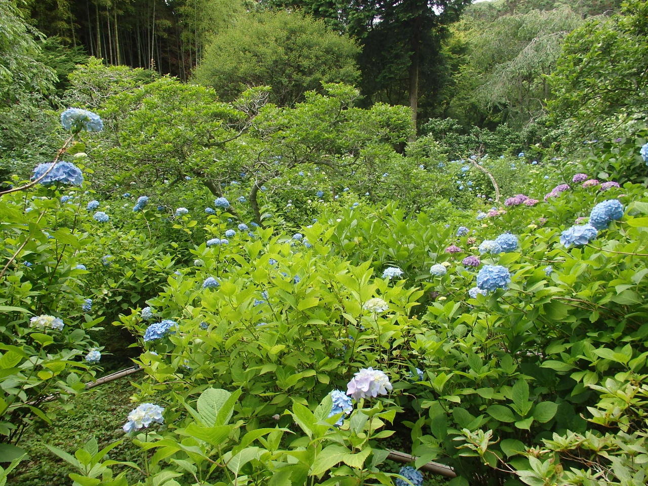 北鎌倉駅から南東へ徒歩9分のところにあります。総門をくぐると参道両脇に青色のアジサイが満開で迎えてくれる。正面の丸窓を通して本堂後庭園が見られるであるが、これを見るために長蛇の列であきらめる。本堂後庭園も花菖蒲を見るための人が多く、入園をあきらめる。開山堂、北条時頼の墓所、やぐらを見る。やぐらは横穴式の納骨窟をいう。鎌倉寺院の多くに見られる。このあと、ピンク、白のアジサイ、ガクアジサイ、カシワバアジサイ、ショウマの園芸種、イワタバコ、終了間際のシャクナゲ等を見る。京都や奈良の寺院も参拝者は多いが、鎌倉は寺院の数が少ないせいか、芋を洗うがごとくの多さで二度と来ないと何度も思ってしまう。アジサイの明月院といわれるので寄ったが、鎌倉長谷寺や奈良矢田寺の方が素晴らしいと思う