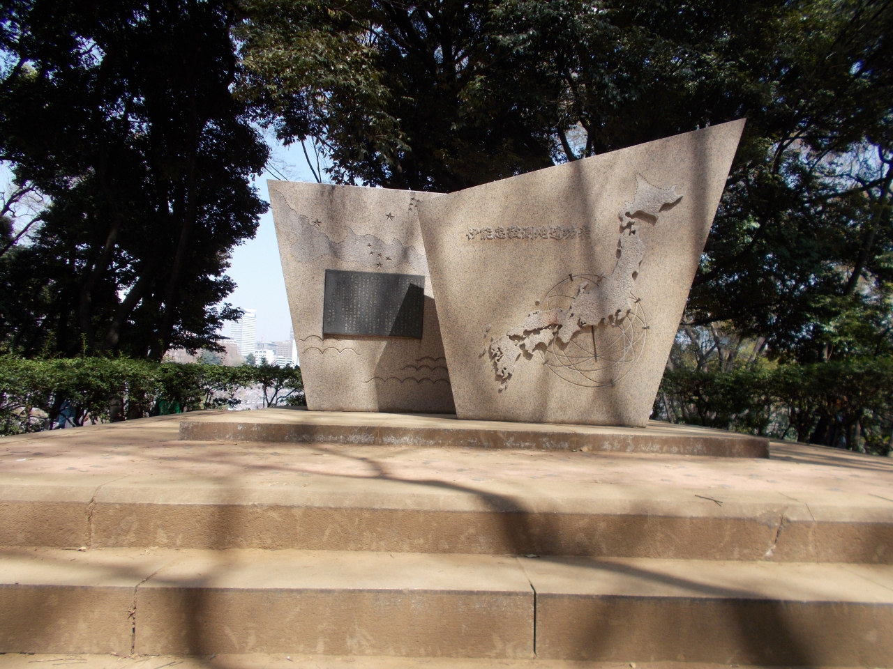 この「伊能忠敬測地遺功表」は芝公園の中にある芝丸山古墳の頂上にあります。伊能忠敬が作成した地図の測量起点が高輪大木戸からだったのでこの場所に記念碑を作ったのです。記念碑は明治22年東京地学協会が作りました。昭和40年に再建したのです。扇型の興味をひく碑です。