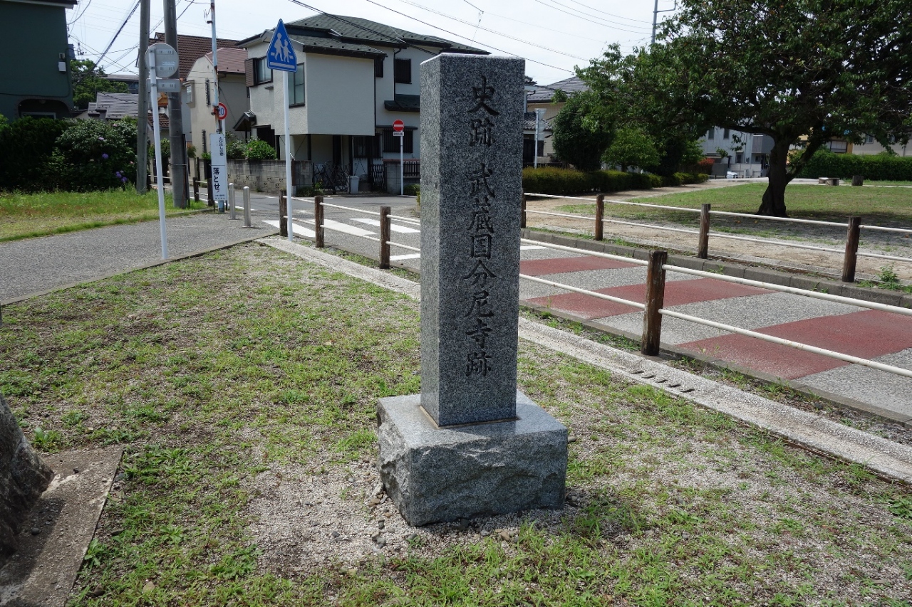 西国分寺駅から南の方向へ下っていくと史跡が集まるエリアがありました。こちらの尼寺跡は武蔵野線の線路に隣接した公園になっていてその一角に石柱が立っていました。シニアのグループが歴史の勉強中だったり小さな子供たちが遊んでいてのどかでした。