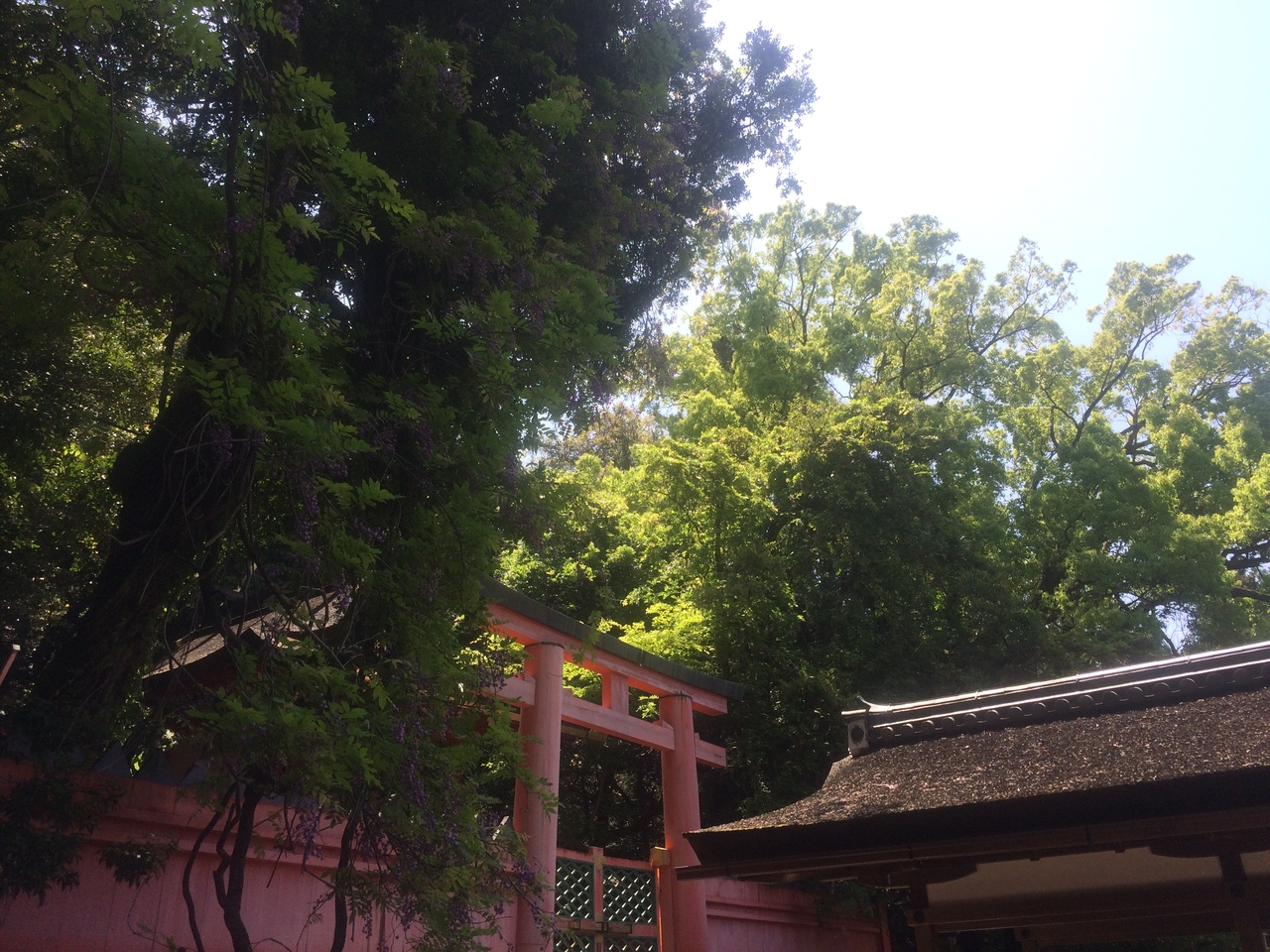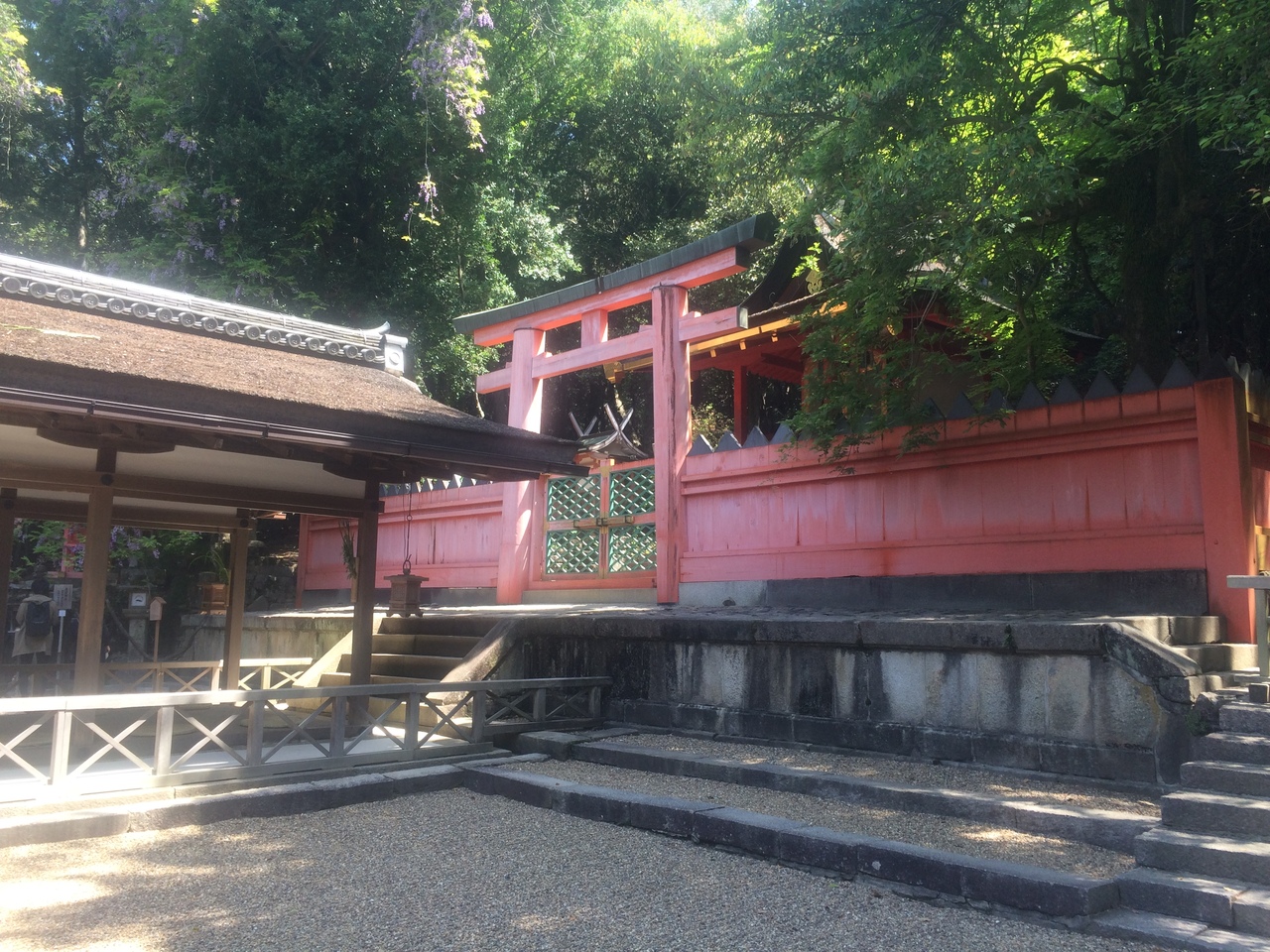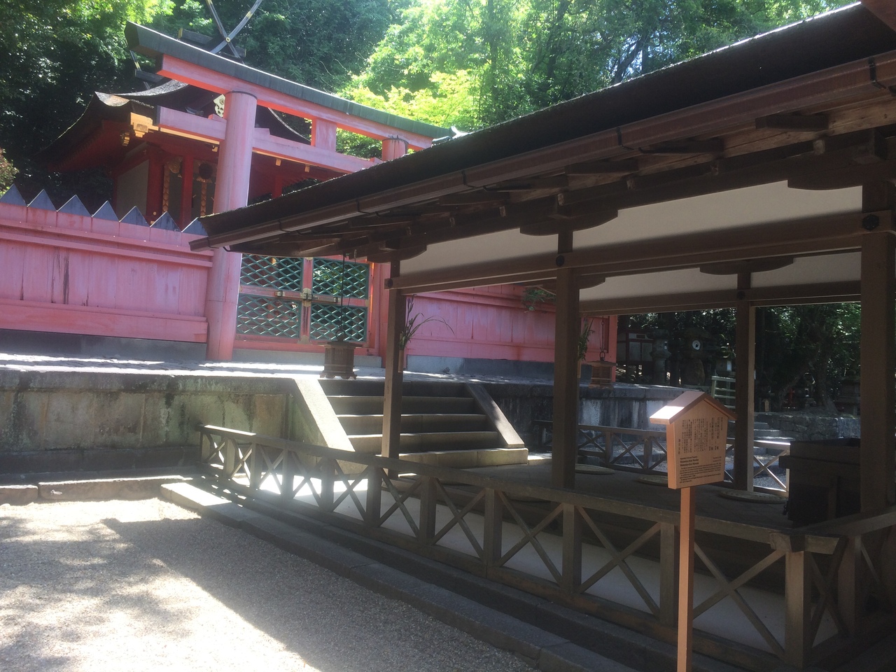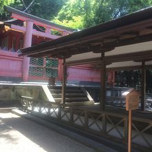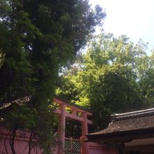 森林に囲まれたような神社で春日大社の本殿から徒歩5分ぐらいのところにあります。少し高いところに赤い鳥居があり左右には柵のような壁があり鳥居には潜らないようになっていました。鳥居まで伸びる廊下のようなものがあり屋根が付いていました。