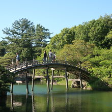 栗林公園の代表的な写真としてよく見かける飛来峰からの風景の正面に位置する橋がこの橋で、美しい橋の形状は見事です。