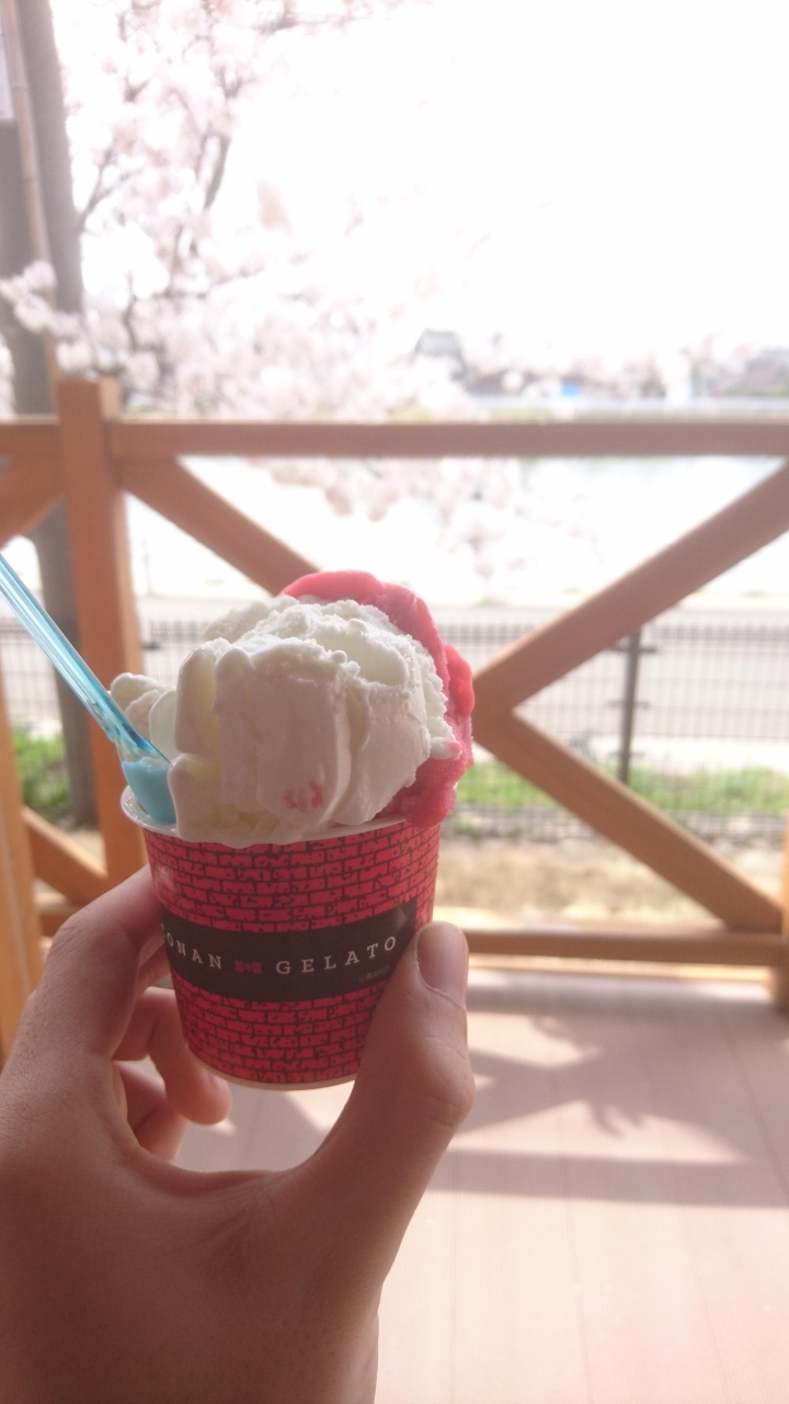 米花商店街に来たときにこのジェラート屋さんに行きました。このジェラート屋さんのメニューには名探偵コナンにちなんだ名前になっているものがあります。そのメニューは1番人気の「APTX4869」というものです。このジェラートは木イチゴと大山ミルクのダブルのジェラートで、味は濃厚で美味しかったです。