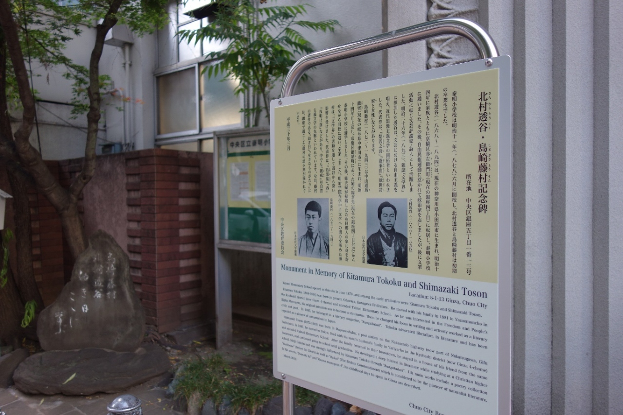 泰明小学校の前にある石碑と説明板です。島崎藤村と北村透谷がこちらで学んだということが彫られた石碑で、横に説明板が有ったので解りやすかったです。明治十一年に開校したとも書かれていて歴史ある学校であることも知りました。