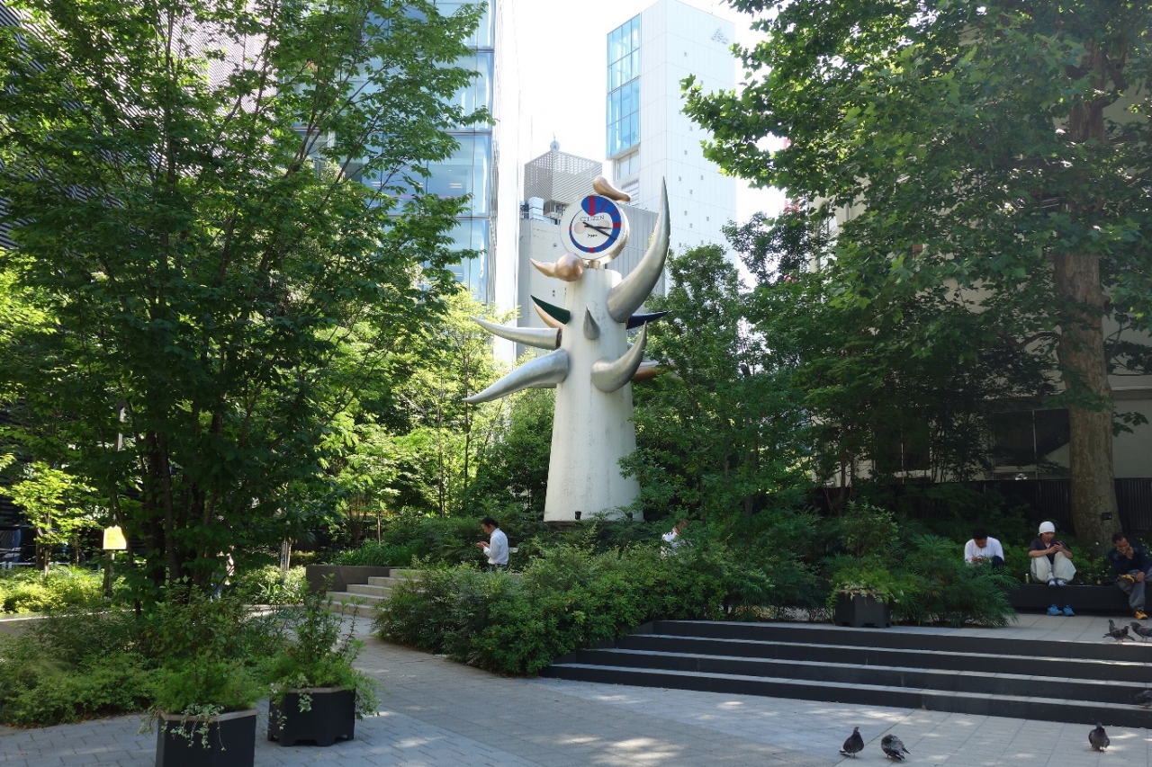 数寄屋橋公園は小さな公園ですが、その敷地に大変目立つ時計が有ります。岡本太郎氏の作品で太陽の塔に似ていますがよく見ると顔の部分が時計になっていました。存在感ある独特な個性を持った時計で目を惹きました。