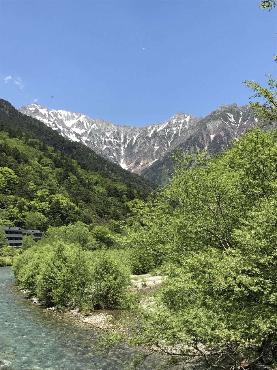 梓川コースは川に沿って整備された道でとても歩きやすく川の向こうには穂高連峰が見えて眺望が抜群でした。