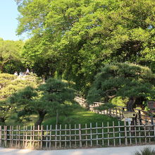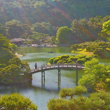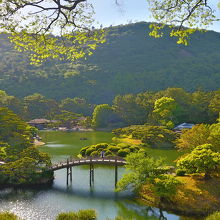 栗林公園の南庭にある南湖の東側に富士山を模した高台があります。それが飛来峰です。栗林公園一の絶景が見られる場所で、飛来峰の頂上は沢山の人がいます。そこから見られる景色は紫雲山を借景として南湖に架かる偃月橋が望め、その奥行のある眺めはポスター等によく使われています。