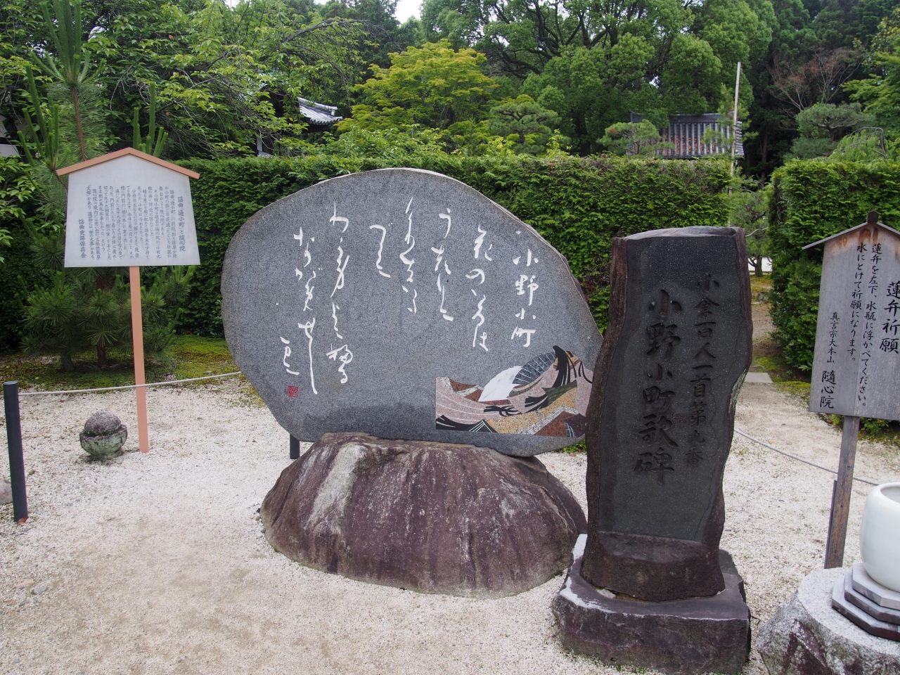 小野小町のゆかりがある髄心院の境内に小野小町の歌の石碑があります。小野小町は晩年の一時期に隋心院に住んだということで、化粧井戸や文塚などの小野小町ゆかりの場所がいくつかあります。門をくぐり、本殿のすぐ前に小野小町が読んだ「花の色は うつりにけりな・・・・」という歌が書かれています。割と新しそうな歌碑です。