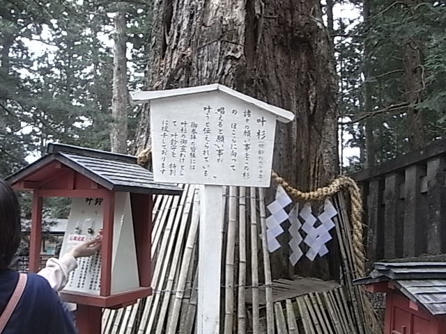 立て札に「は樹齢600年、諸々の願い事をこの杉のほこらに向かって唱えると願い事が叶うと伝えられている」と書いてあり、多くの参拝のお客さんはお祈りしています。