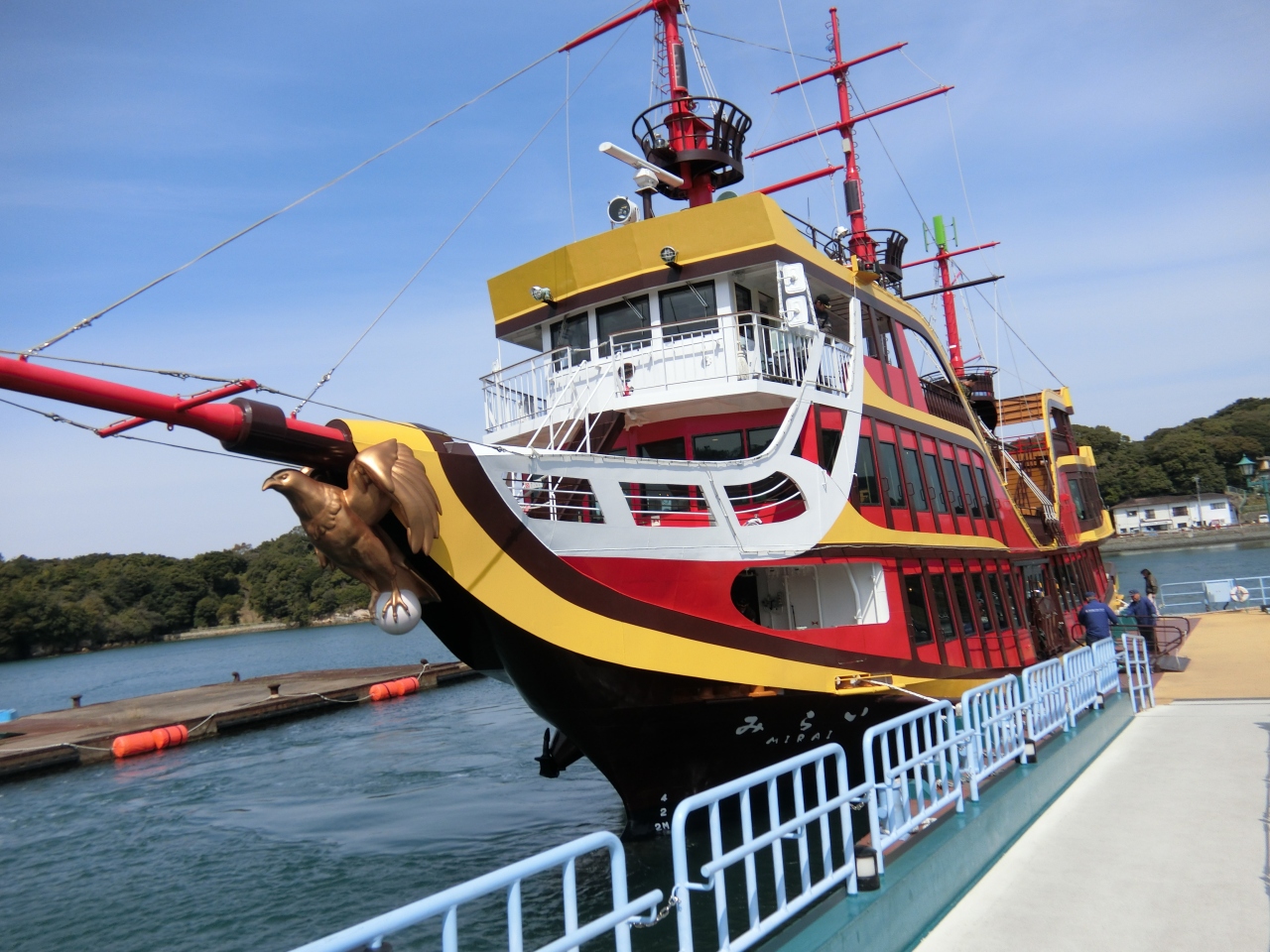 石岳展望台を見終え、下っていくと森きららがありました。ここからパールシーリゾートまでのシャトルバスが出ています。パールシーリゾートには、九十九島を観光する海賊遊覧船が出ています。結構たくさんの人が乗り込んできました。船内では放送が入り、九十九島の説明がされます。島の間を船が通り近くで見られ、よかったです。