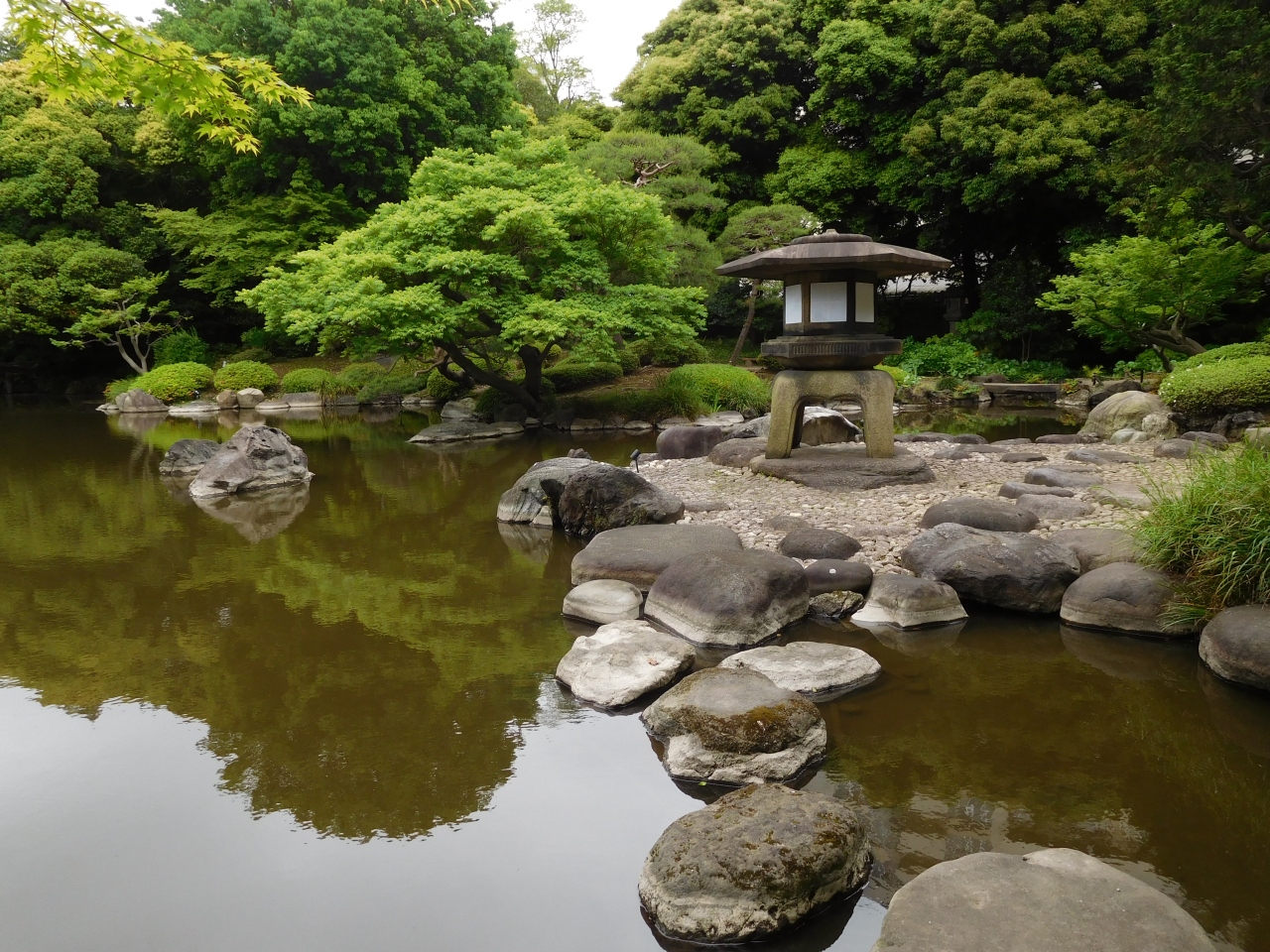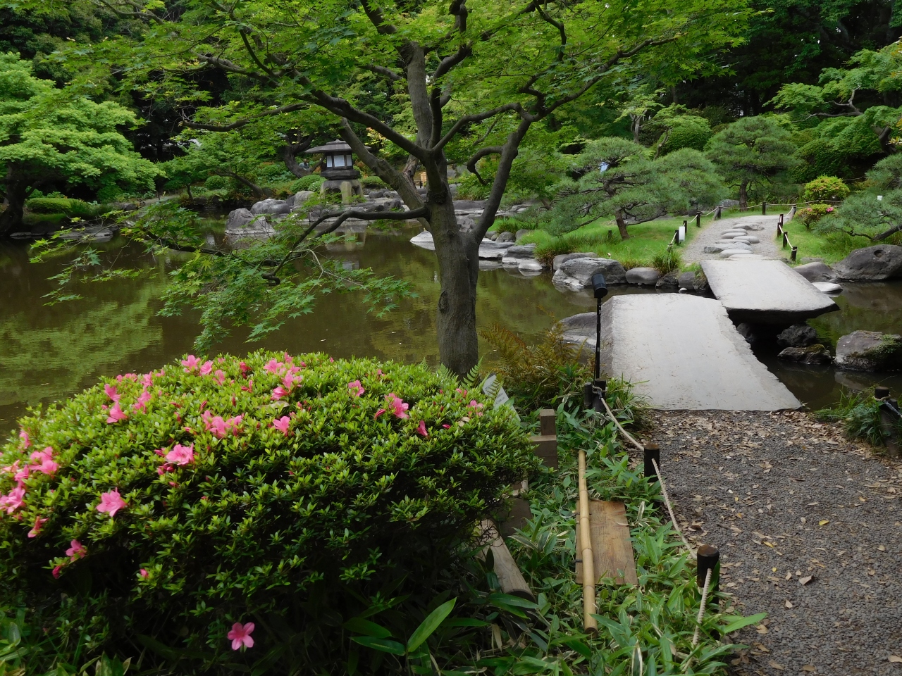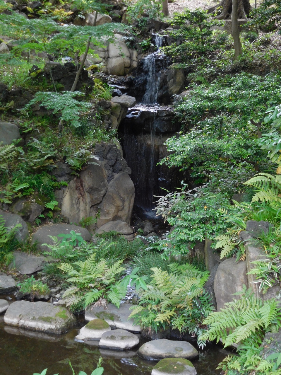 新緑の中、心字池周囲の枯滝、雪見灯篭、大滝を見ながら歩きました。