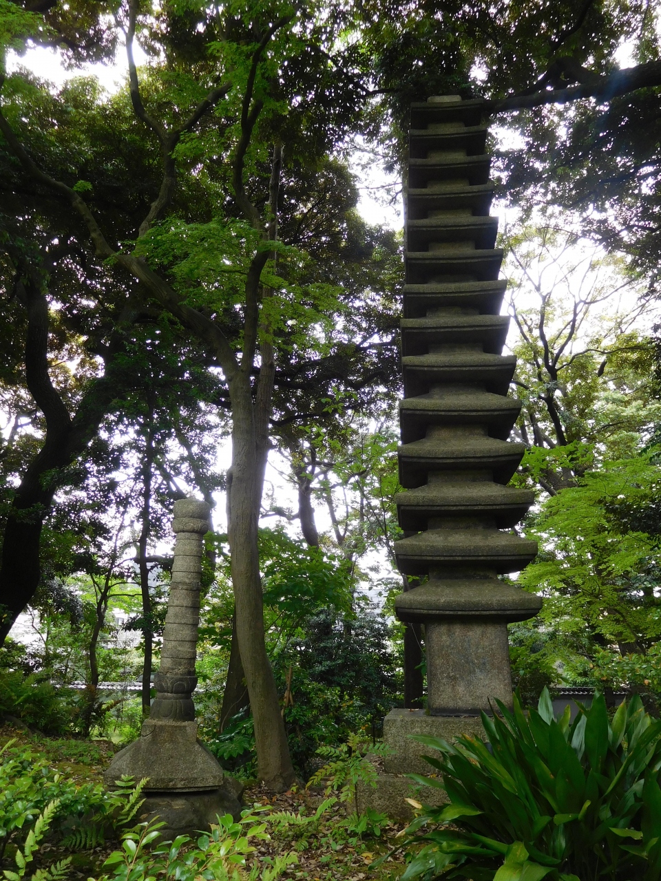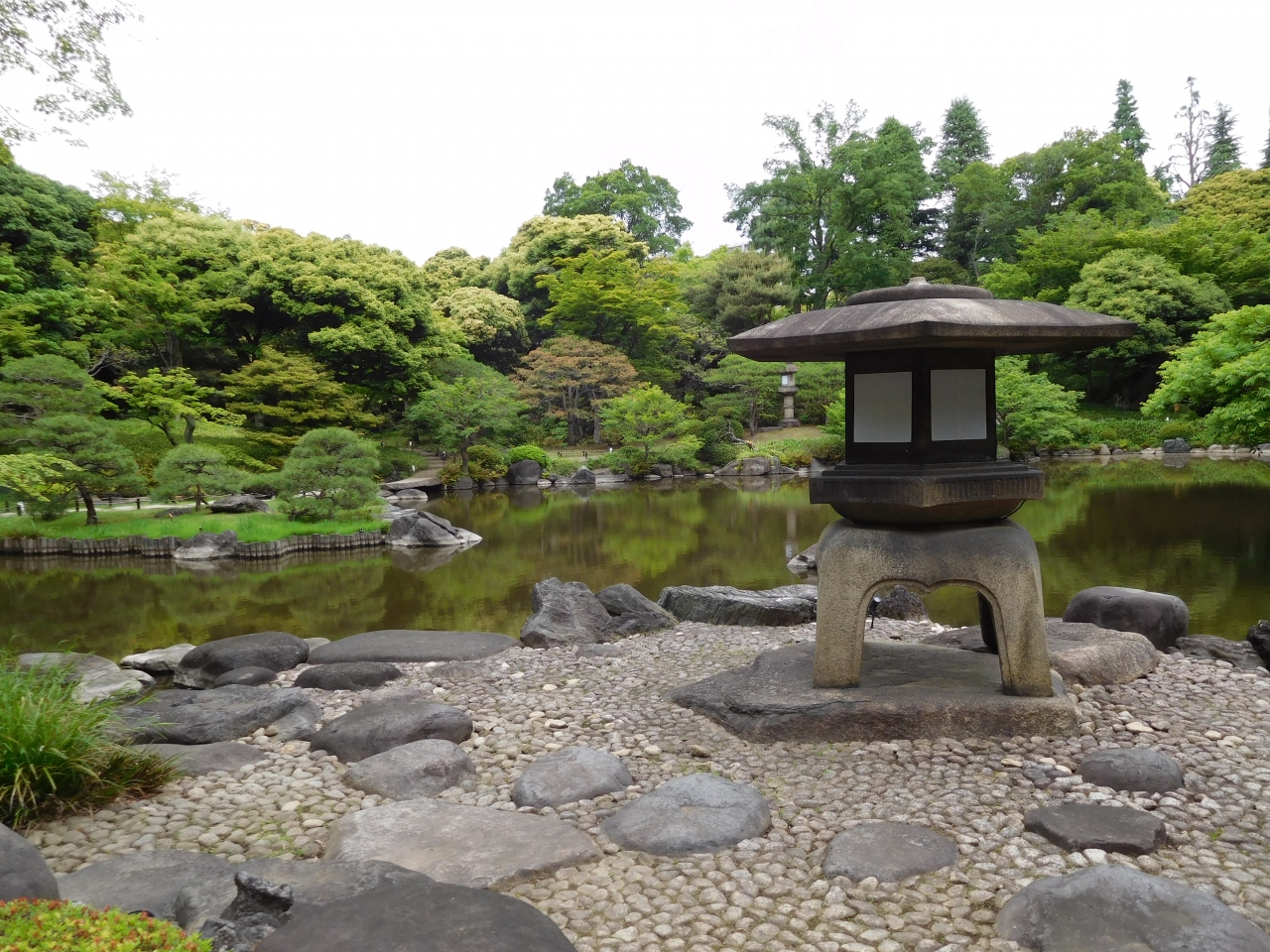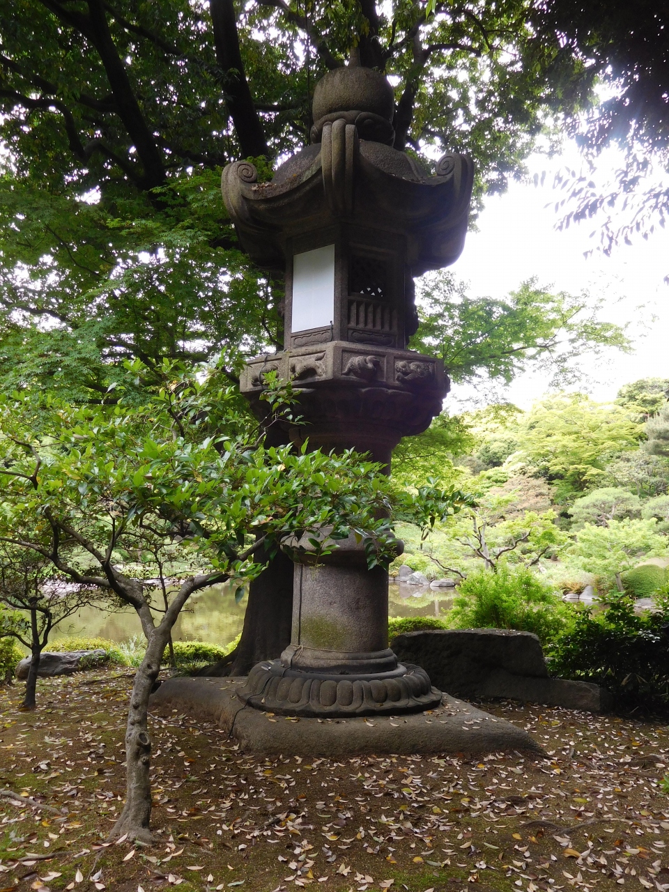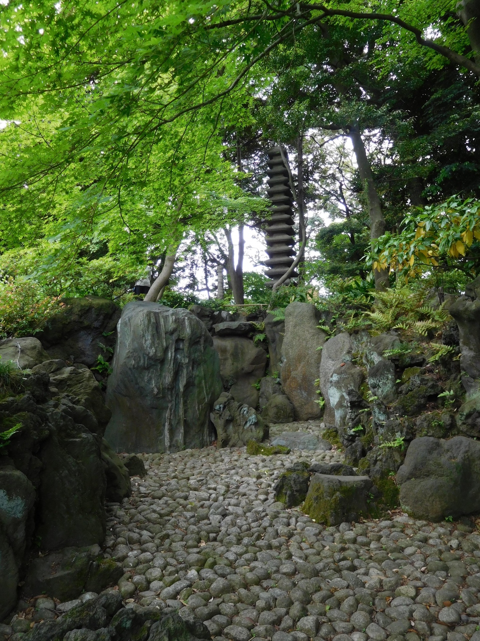 新緑の中、心字池周囲の枯滝、雪見灯篭、大滝を見ながら歩きました。