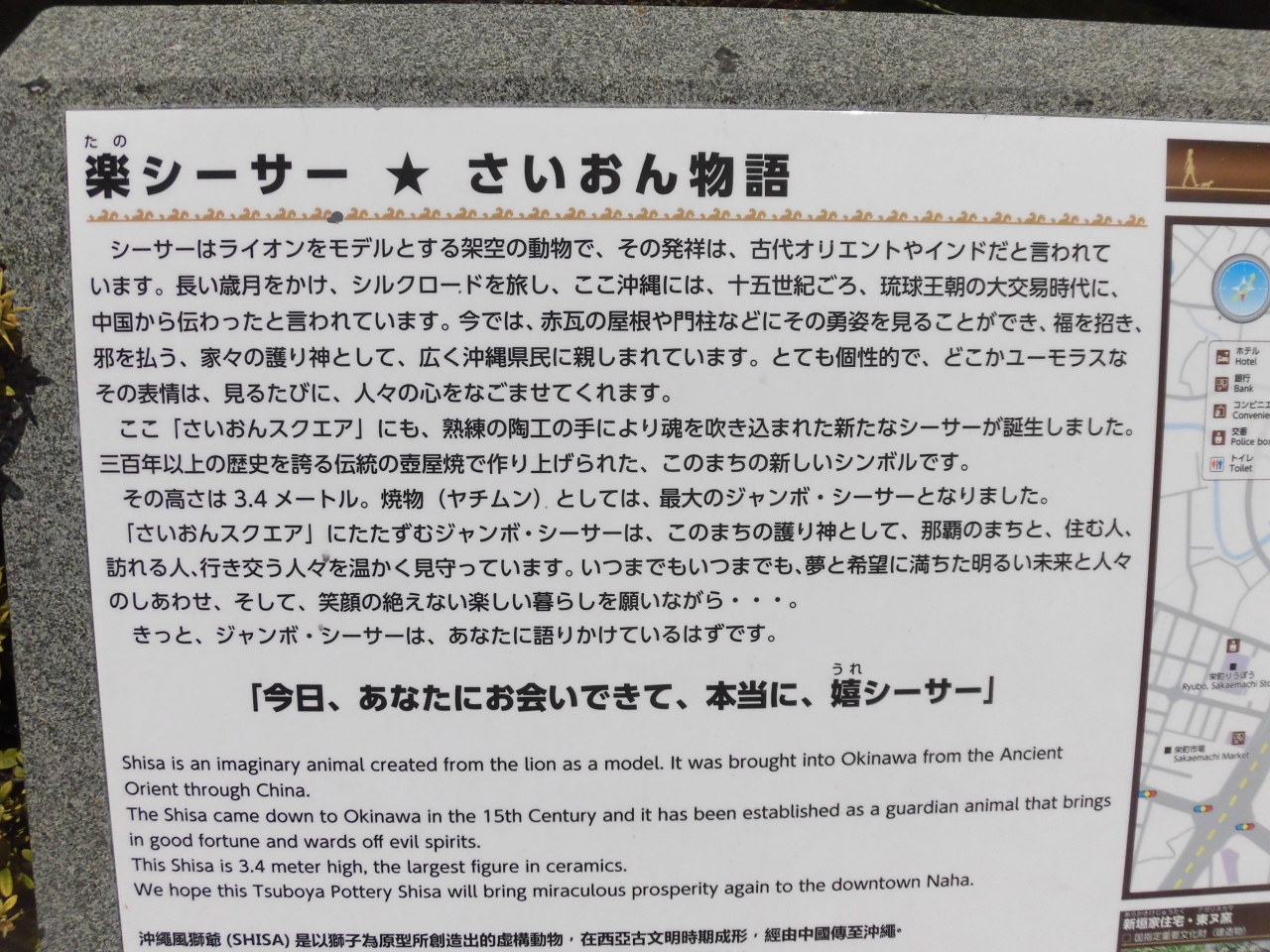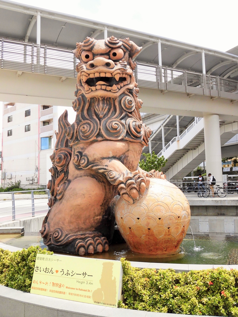 2012年3月、牧志駅前に巨大なシーサーができました。駅から「さいおんスクエア」へ2階部分の連絡橋で行くと行き過ぎますので、1階から行ってください。川沿いにあるのですぐにわかります。周りに何もないので、駅の方から見たときにはそれほど大きいとは思いませんでしたが、写真を撮るために近づくと、改めて大きいことが感じられました。