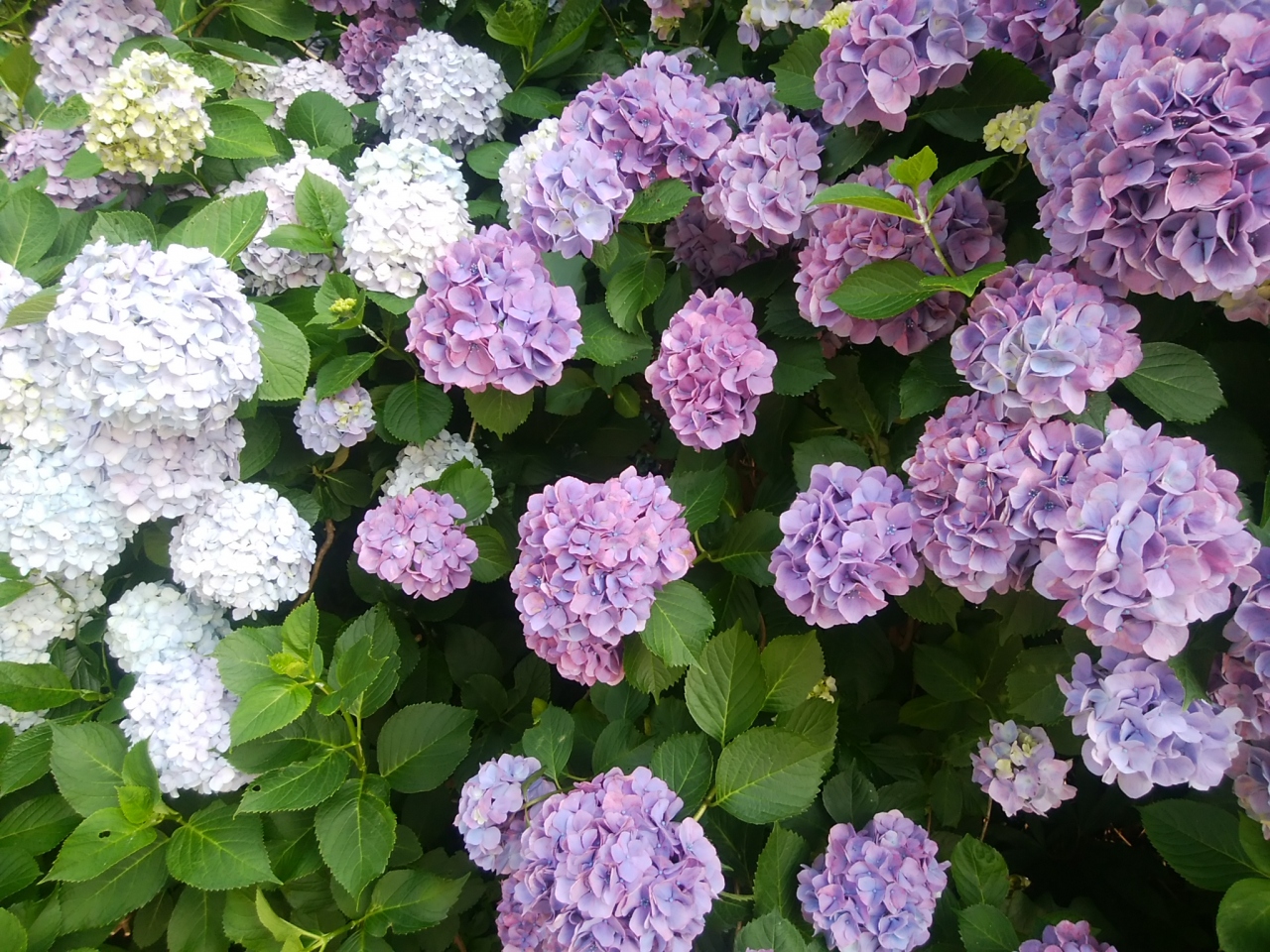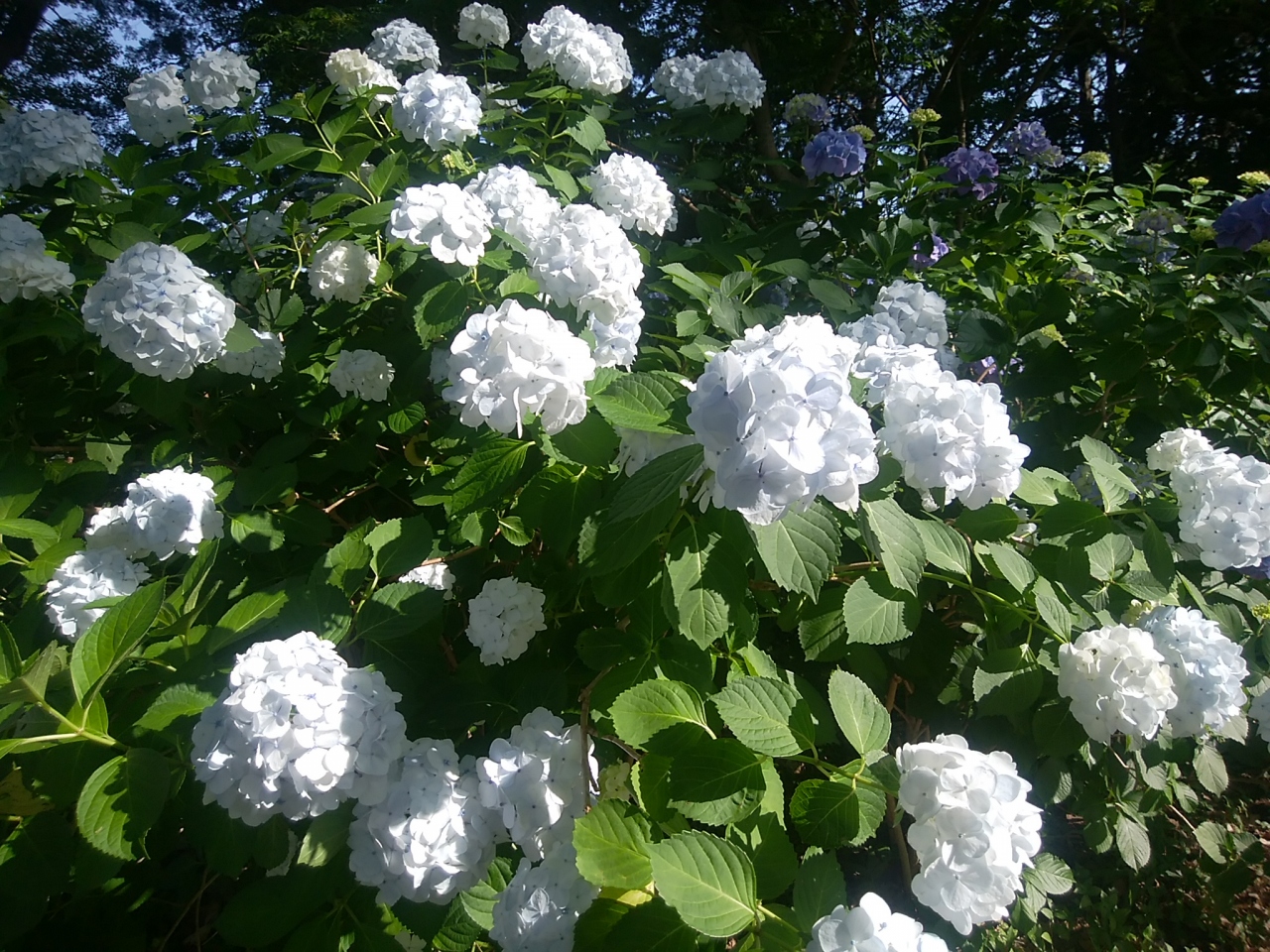 6月前半ですが、ちょうど見頃のような見事なあじさいでした。山全体にいろいろな色と種類のアジサイが咲き乱れてとってもきれいでした。