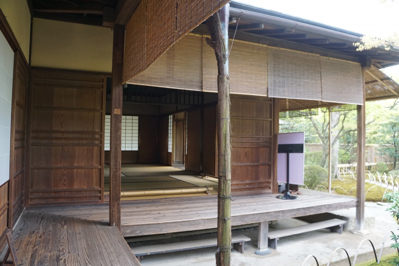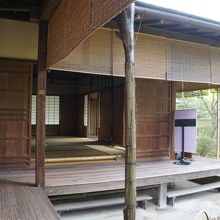 旧正伝院書院は、有楽苑の順路に従って進むと最初に訪れる建物。これは、織田有楽が建仁寺の塔頭正伝院を再興し、隠居所として建築した建物。門から入ると入口がありますが、むしろ、見応えがあるのは裏手の三方に縁をめぐらした客殿の方。開放感があって涼しげな佇まいは、風流の極といった趣です。