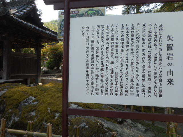 ゴールデンウイーク中に、岡山の吉備観光で、吉備津神社を訪問しました。その神社の入り口にあるのがこの石ですので、わかりやすい場所です。苔が生えている大きな石で、吉備津彦命がここに矢を置いたという伝説があるらしい。説明板もあってわかりやすいです。