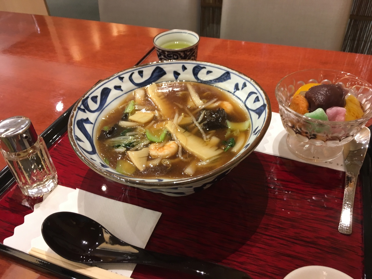 あんかけラーメンとあんみつのセットを注文。ラーメン通がなんと思うかは知らないが、それなりの具が乗った温かい麺をしっかり食べられるという意味で価値がある。また、あんみつの餡が自分好みの甘さ加減だったので幸せな気持ちに。