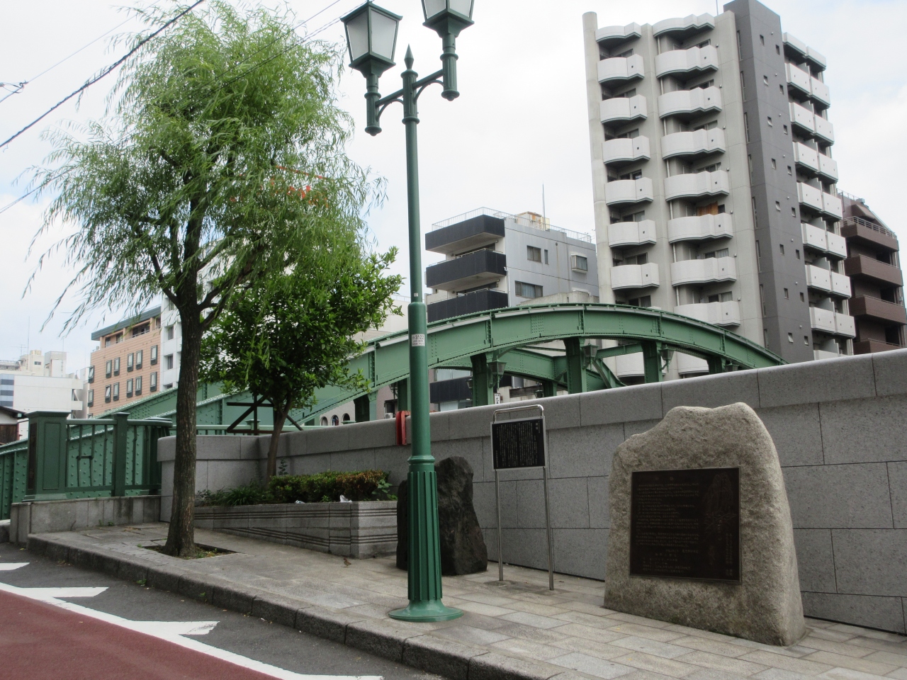 神田川が隅田川に流れ入る河口部に架かる40mほど橋です。江戸時代、花街だったことから橋の欄干にはかんざしのレリーフが飾られています。橋のたもとには船宿や佃煮屋が残り、柳の木も植えられています。橋からは屋形船が係留されている様子を眺めることができます。花街の面影は無くなってしまいましたが、映画やドラマのロケ地にもなったところで、訪れた日には写生を楽しんでいるシニアの方たちの姿が見られました。どことなく江戸時代の面影が感じられる橋周辺です。