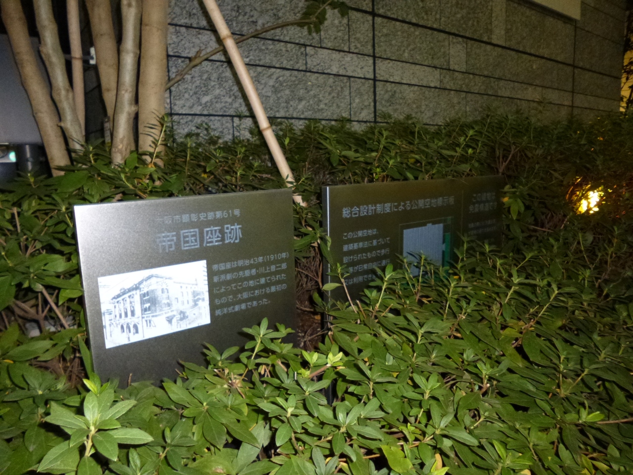 淀屋橋と肥後橋の間、裏通り沿いにある近代的なビル前の植え込みに「帝国座跡」を示すレリーフがありました。「帝国座」は、大阪で初めての純洋式劇場だったという事です。イラストが記載されているので、少しだけイメージが沸きました。