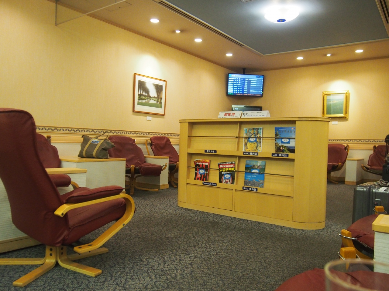大淀ラウンジはJAL、ANAの共用ラウンジです。席などは多くないので、朝、夕のビジネスマンが利用する時間帯は混雑しているようですが、利用した日曜日の午前中は空いていました。飲み物はビール、ウイスキー、焼酎、コーヒー、ソフトドリンクなどがあります。また袋入りのピーナツが置いてありました。新聞、雑誌も置かれていました。