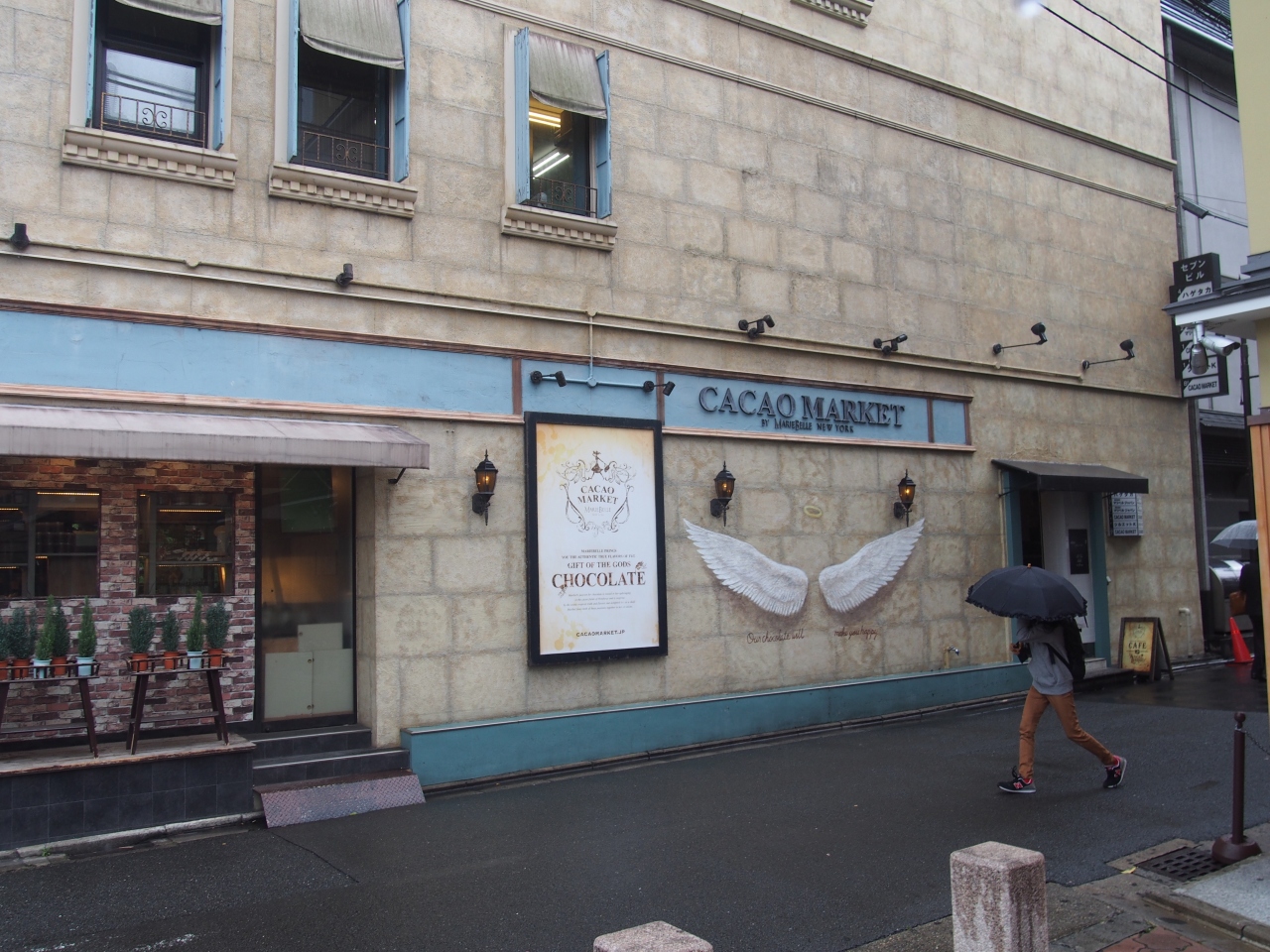 四条大橋から鴨川沿いに少し歩くとカカオマーケットの店があります。店の外観、内部もお洒落感のある店で、いろいろなチョコレートやブラウニーやジェラートなどがあります。カフェも併設されていますが、待ち時間があったので諦めました。店の外の壁には天子の羽があり、インスタ映えしそうな感じでした。写真を撮って帰りました。