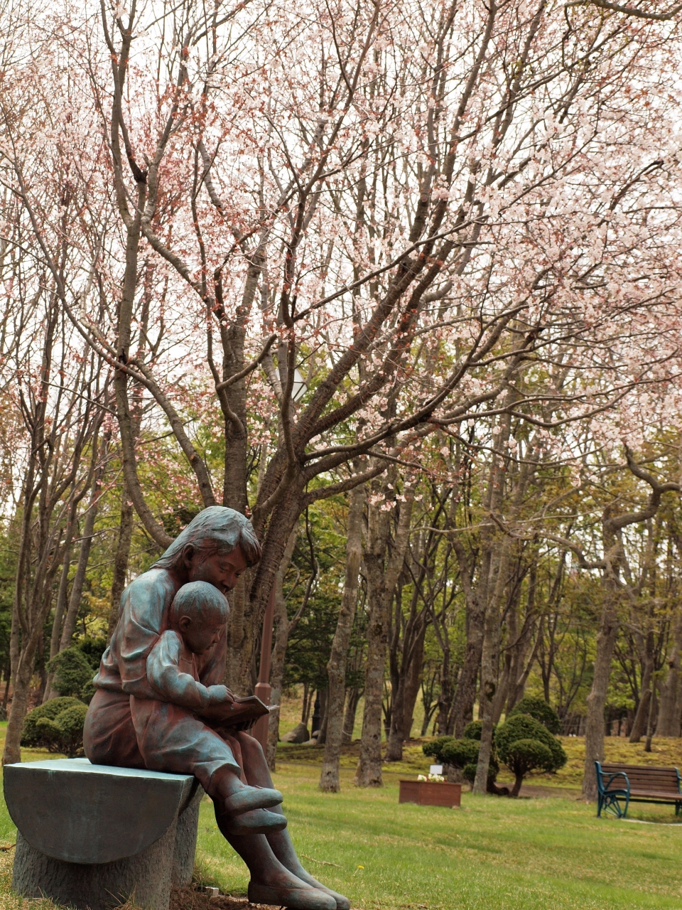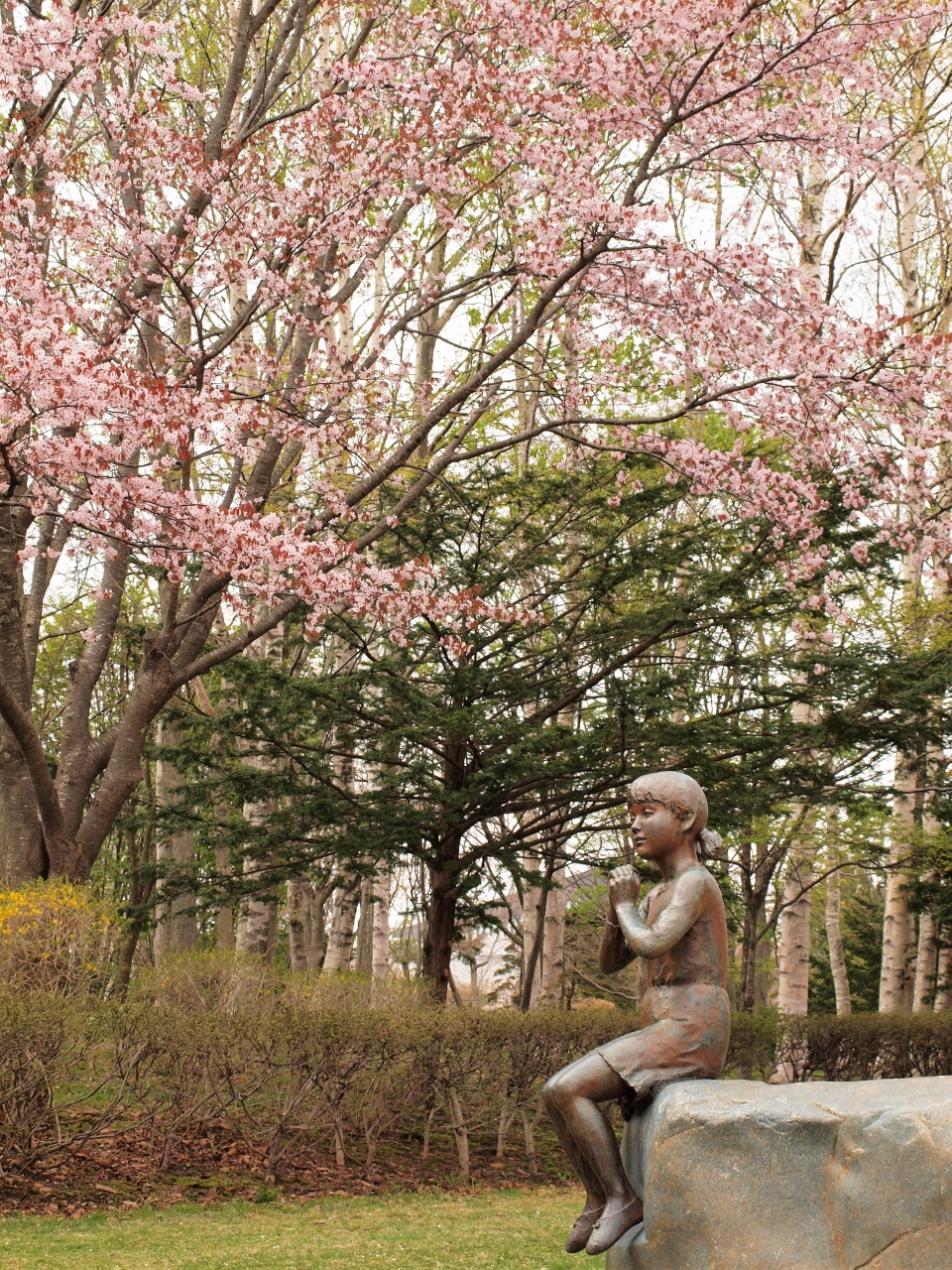 白樺林が芽吹き、桜が咲く園内には彫刻の人物像などが置かれていたり、東屋があったりして、とても気持ちのいい公園で、しばし穏やかな時間を過ごさせて頂きました。