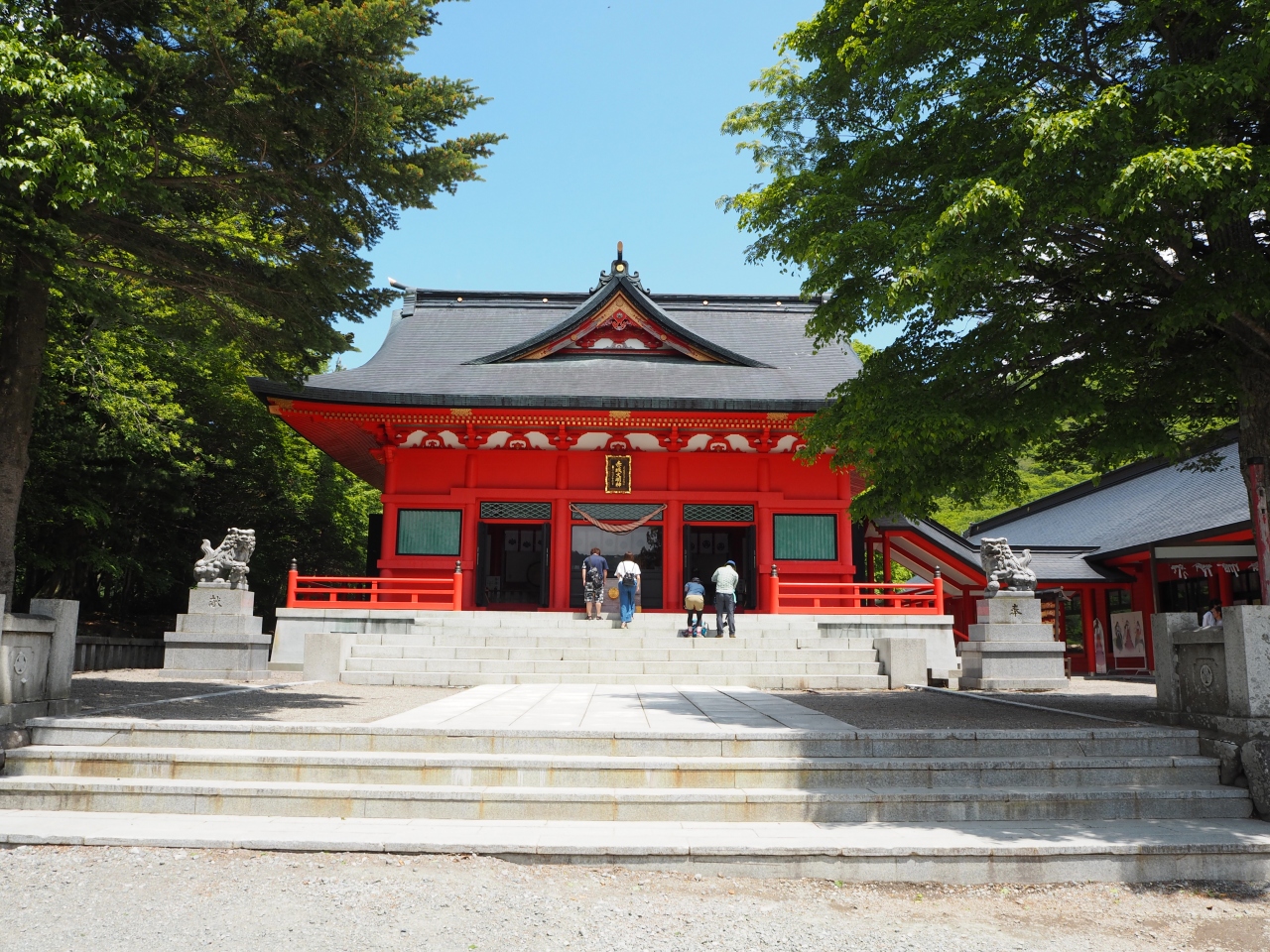 赤城山の中腹にある大沼のほとりの神社です。こちらの御朱印帳は十二単の女性が描かれた素敵なデザインでした。通常は赤ですが、夏限定版で白地のものも販売されていました。サイズは少し大きめでした。御朱印をいただくのに10人ほど待ちました。