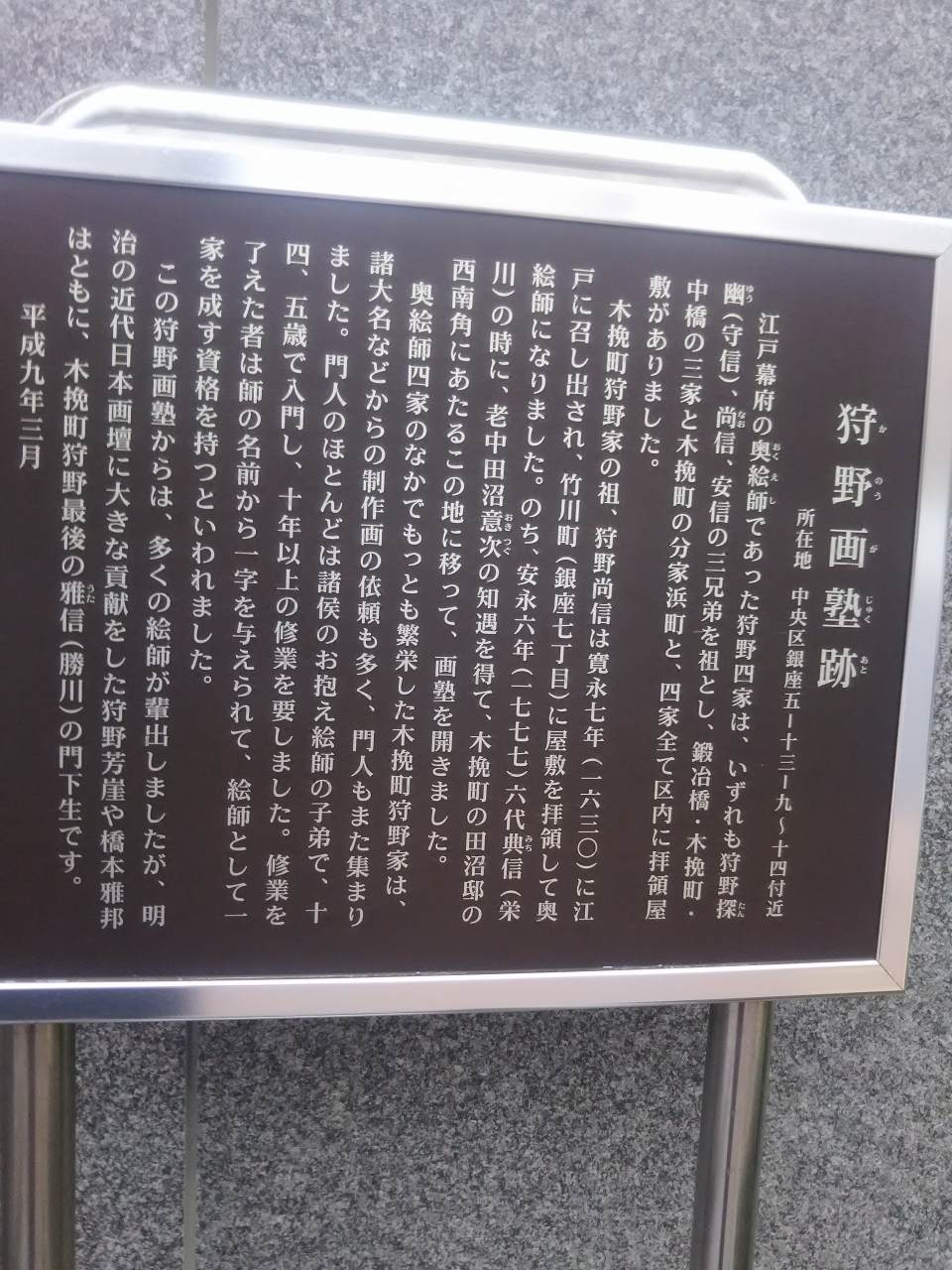 江戸時代に徳川幕府の意思をしていた狩野派の塾がこちらにあったそうで、今はオフィスビルの片隅にひっそりと説明用の案内があるだけです 場所としては東銀座の駅を出て昭和通りから汐留に向かう方面で駅からは歩いて1分ぐらいの場所です 狩野派の絵というのは今でもとても人気があるのでこちらが発祥であったということに大変驚かされた