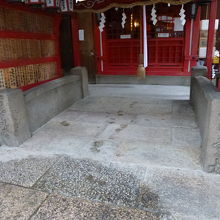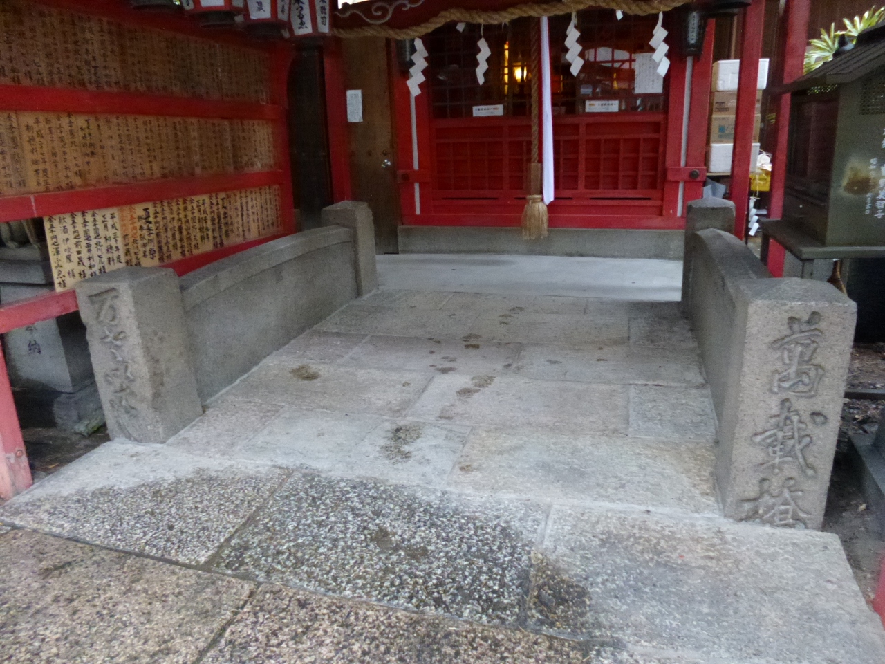 「綱敷天神社 御本社」の境内、喜多埜稲荷神社の鳥居と祠の間に「萬載橋」があります。橋とは言っても川が流れているのではなく、欄干のみが保存されています。