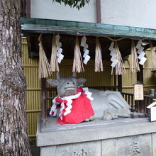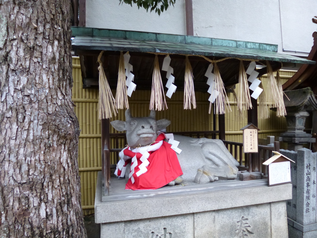 大阪市北区神山町の「綱敷天神社 御本社」は、菅原道真公を祀る神社であることから、境内には牛舎があります。石造りのモノトーンの外観で、それほど大きな牛ではありませんが、キリっとした視線を送る印象的な像でした。境内の必見スポットのひとつです。