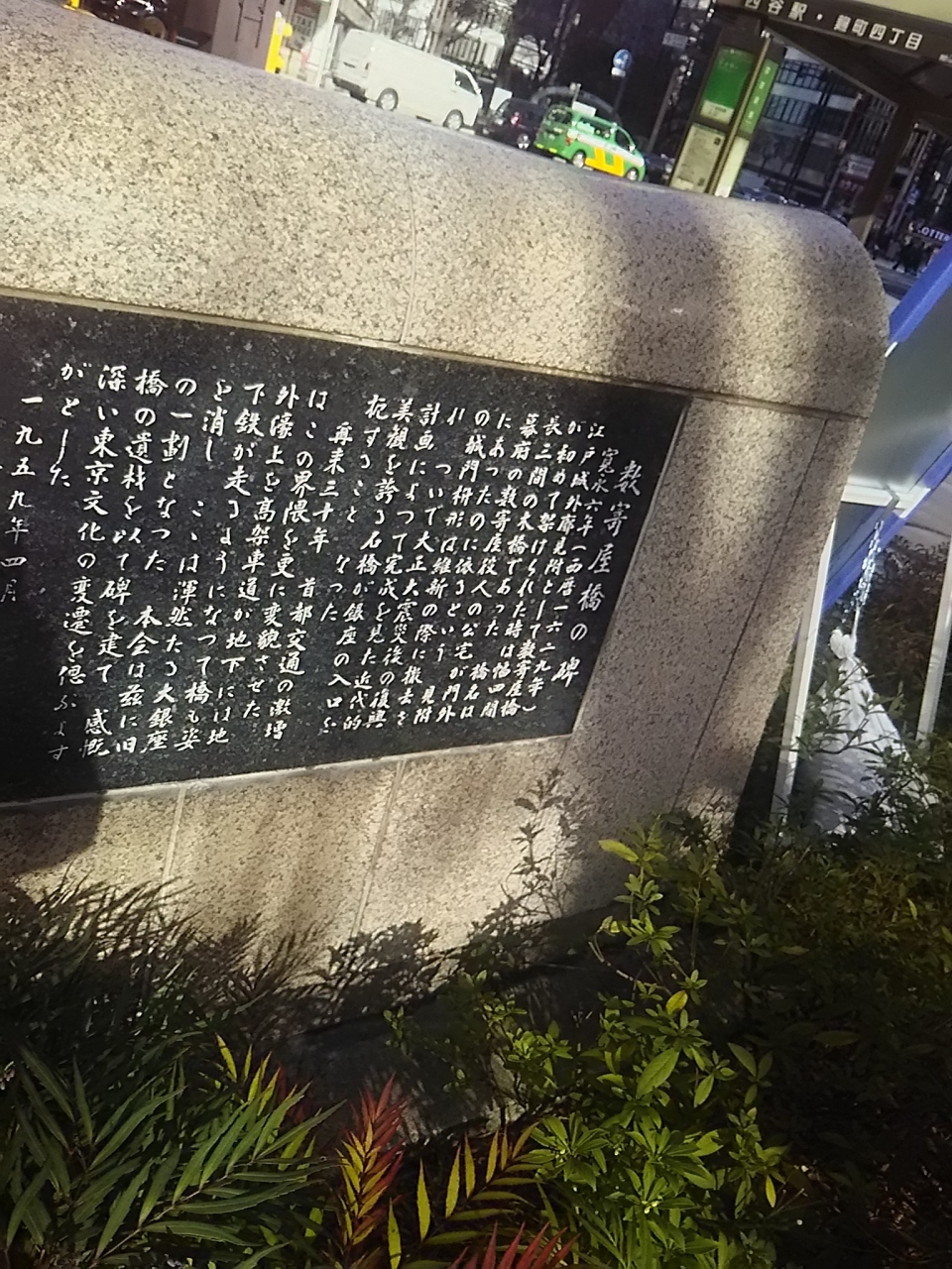 数寄屋橋という名前の通り江戸時代にはこちらでは橋がかけられていたということだそうで大変驚きました 記念碑があるため色々とその歴史を見ることができます 今はすっかりと開発され高速道路ができたり、周辺の開発で変貌していく中で橋はなくなったそうです