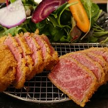 薄くカットされた牛かつは、まわりがサクサク、中の牛肉はレアでジューシー。